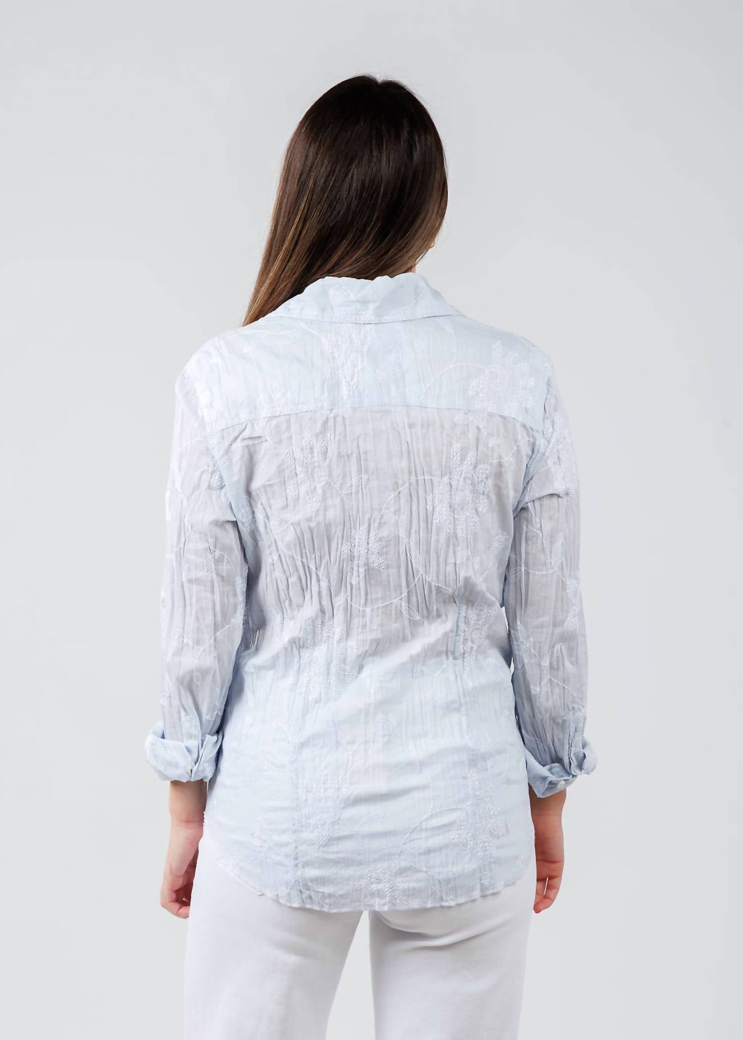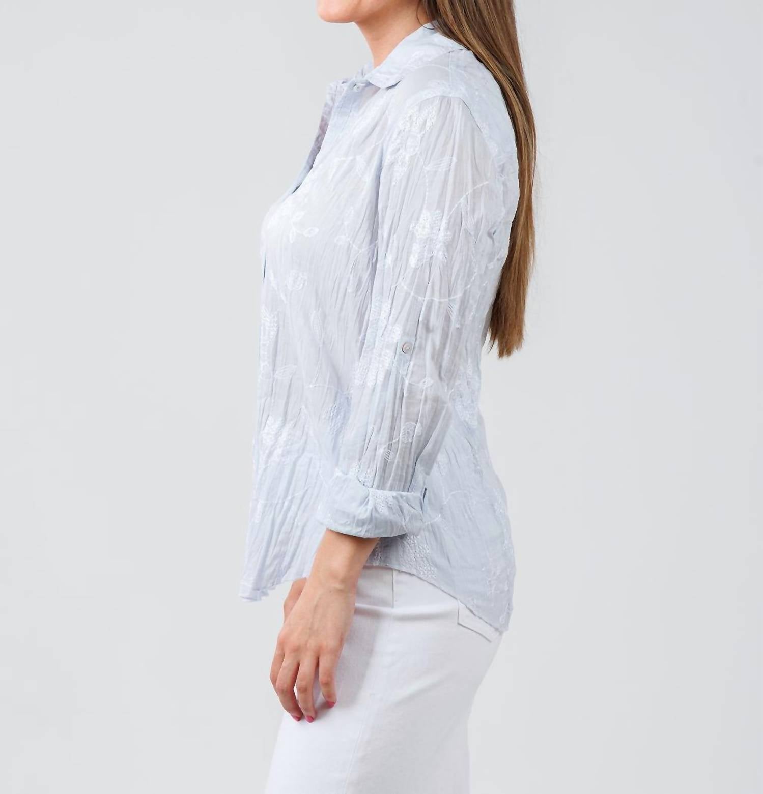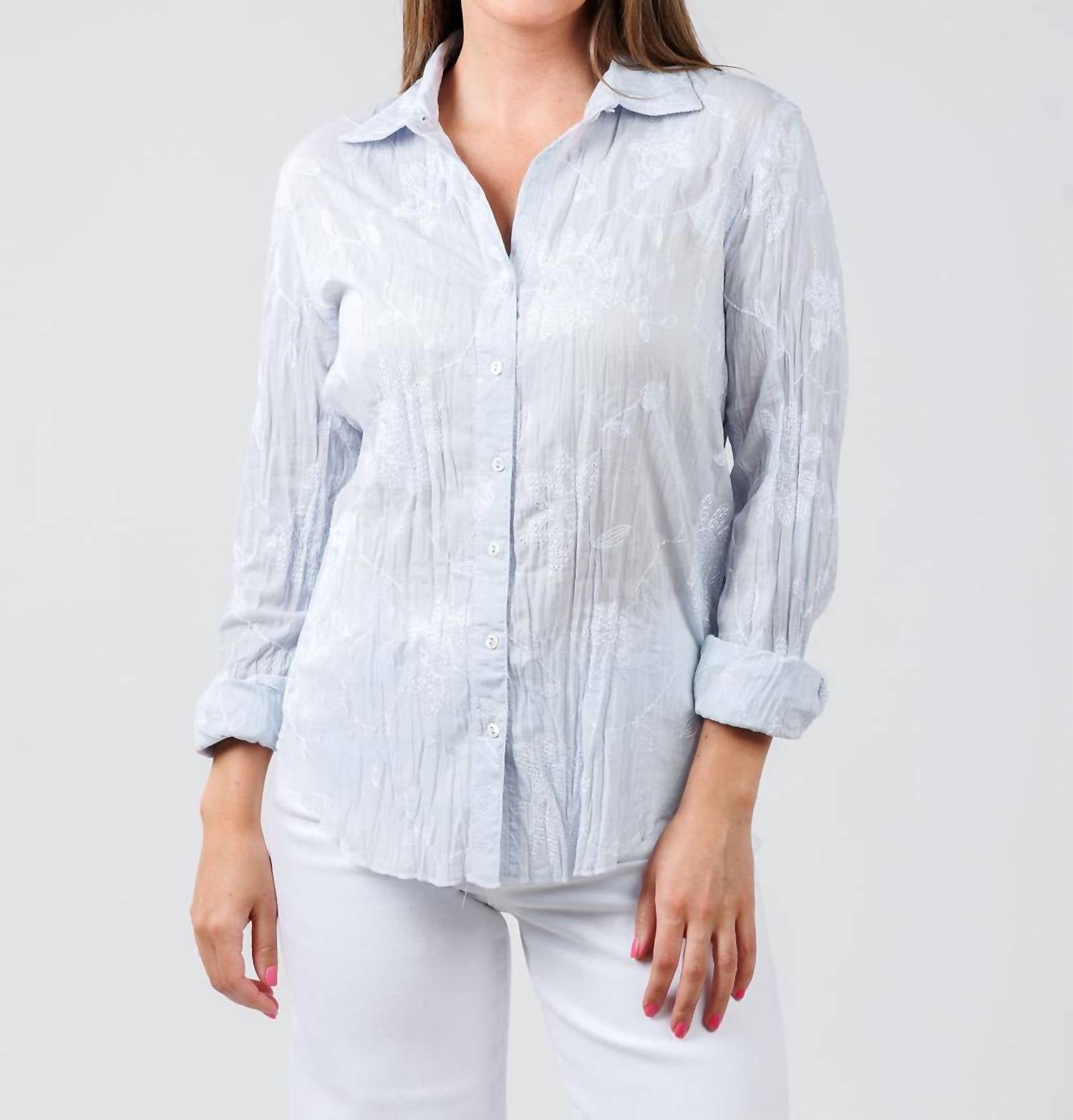 Discover the Cino Martinique Embroidered Shirt in a charming light chambray, embodying effortless island elegance for your spring wardrobe. This long sleeve button-down is crafted from 100% cotton, showcasing delicate white floral embroidery on crinkle voile fabric. It features a stylish button closure with roll-up sleeves and a shirt collar, perfect for layering or pairing with summer favorites. Care instructions advise machine washing to maintain its cool, bohemian charm. Modeled by Faryn, who is 5'6" tall with a 34" bust, 28.5" waist, and 31" hip, wearing a size small.