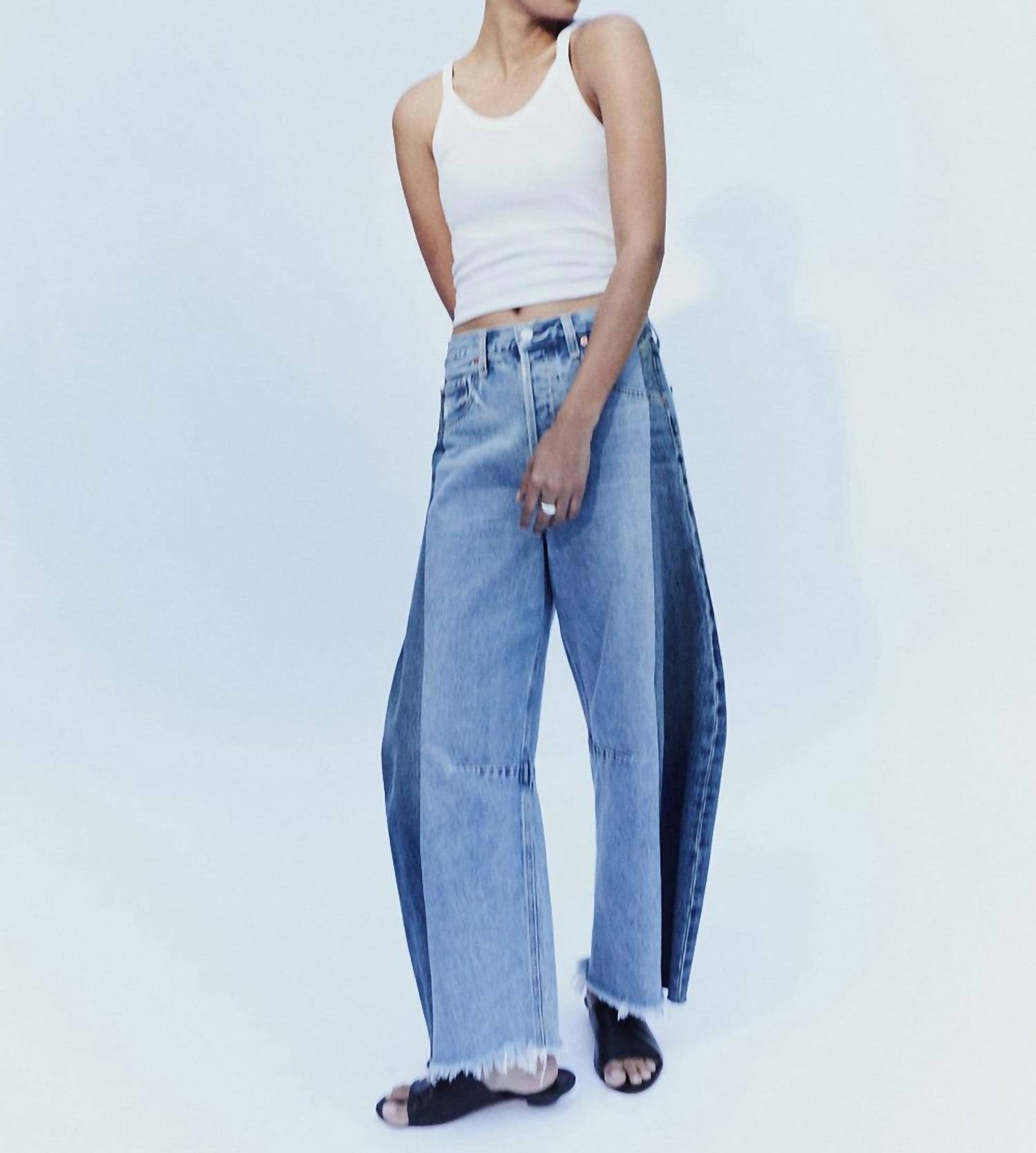 Introducing the Pieced Horseshoe Jean by Citizens of Humanity, a standout piece in Fracture that marries vintage-inspired design with modern style. Featuring a high-rise comfort fit, these two-tone reconstructed jeans boast a wide leg that gently tapers to cropped, frayed hems, creating a flattering silhouette. Crafted from 100% regenerative cotton, the midweight fabric feels both breathable and soft, embodying a vintage aesthetic. Closure: Button fly. Care: Machine wash cold inside out with like colors, do not bleach, tumble dry low. With a rise of 13 1/8 inches and an inseam of 26.5 inches, these jeans are an effortlessly stylish choice for a music festival. Model is 5'10" and wearing a size 27.