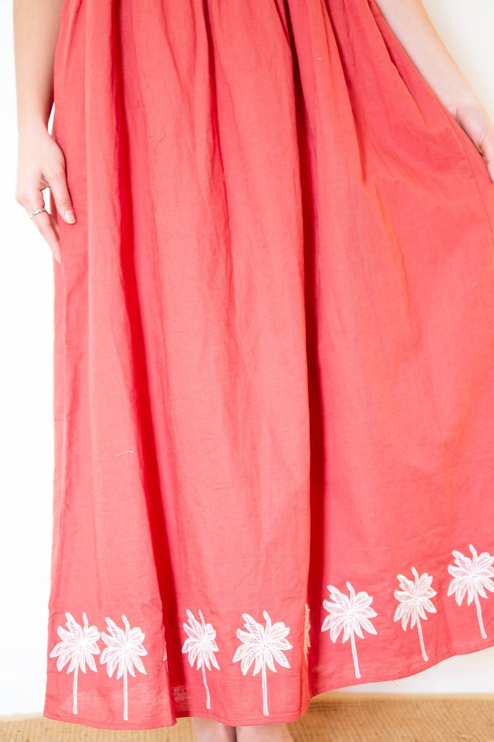 A maxi dress that is just as cute as it is comfortable. Get ready for summer with the Swim Bella Dress by CITRINE, a vibrant maxi dress in a stunning brick color. This dress features delicate spaghetti straps and a chic empire waist silhouette, complete with beautiful embroidered detailing on the hem. Crafted from high-quality linen, it offers a comfortable and breathable fit ideal for warm weather. With a pull-on closure style and a stylish squareneck, this piece is perfect for effortless elegance whether you're on the beach or out for brunch.