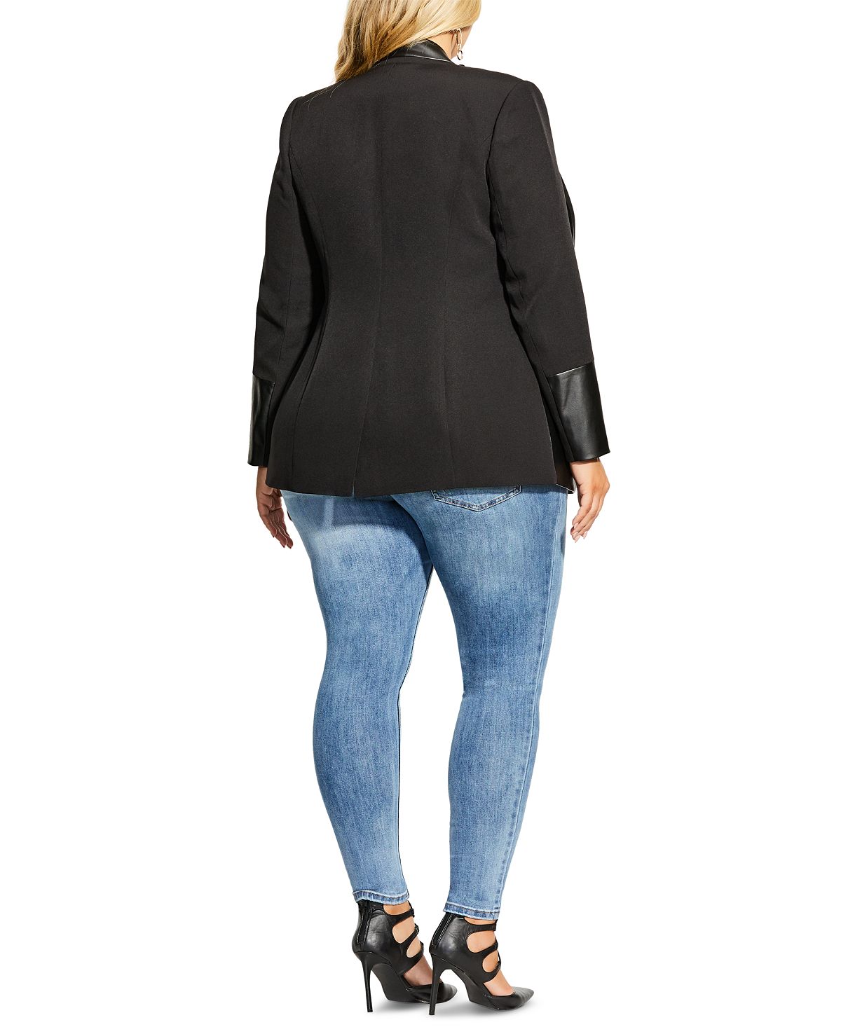 From office to out on the town| your look will stay polished with City Chic's plus size blazer| a structural design accented with sleek faux leather trim. | Approx. length; 30-3/5| Faux leather trimmed collar; single hook-and-eye closure at front| Faux leather trim at sides and cuffs;