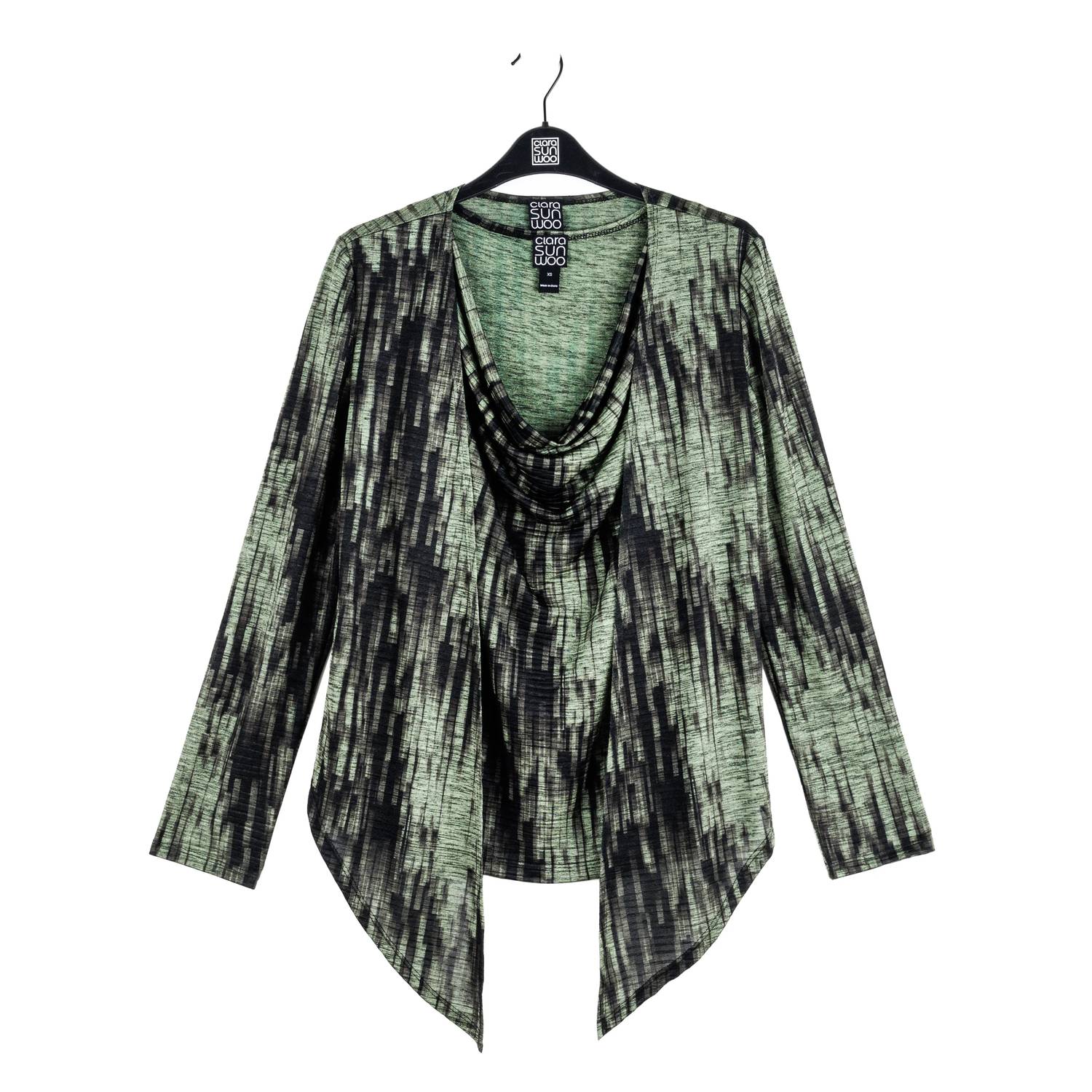 This cardigan will be a sweater-rotation favorite. Introducing the Crinkle Pleat Knit 2pc Cardigan and Cowl Tank Twinset by CLARA SUNWOO, a stylish ensemble in a captivating olive and black abstract print. The cardigan features an optional tie front design with long sleeves, while the accompanying tank boasts a flowing draped cowl neck with bra-friendly straps. Made from a blend of 95% Polyester and 5% Spandex, this set is inspired by crinkle-pleat fibers with lusciously soft ridges, offering durability and breathability. Care: Hand wash for lasting quality and maintenance of the luxurious texture.