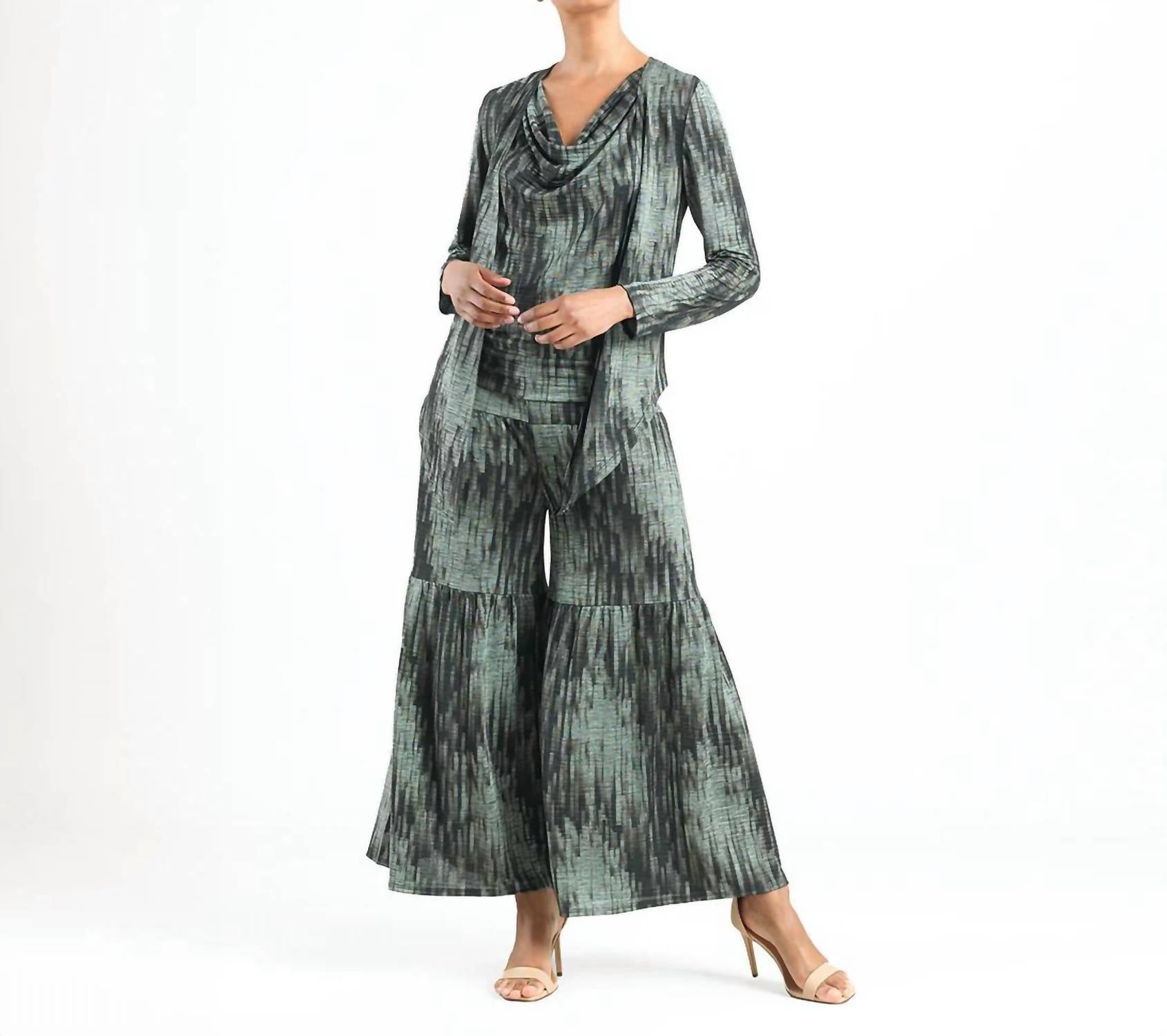 Introducing the Crinkle Pleat Knit 2pc Cardigan and Cowl Tank Twinset by CLARA SUNWOO, a stylish ensemble in a captivating olive and black abstract print. The cardigan features an optional tie front design with long sleeves, while the accompanying tank boasts a flowing draped cowl neck with bra-friendly straps. Made from a blend of 95% Polyester and 5% Spandex, this set is inspired by crinkle-pleat fibers with lusciously soft ridges, offering durability and breathability. Care: Hand wash for lasting quality and maintenance of the luxurious texture.