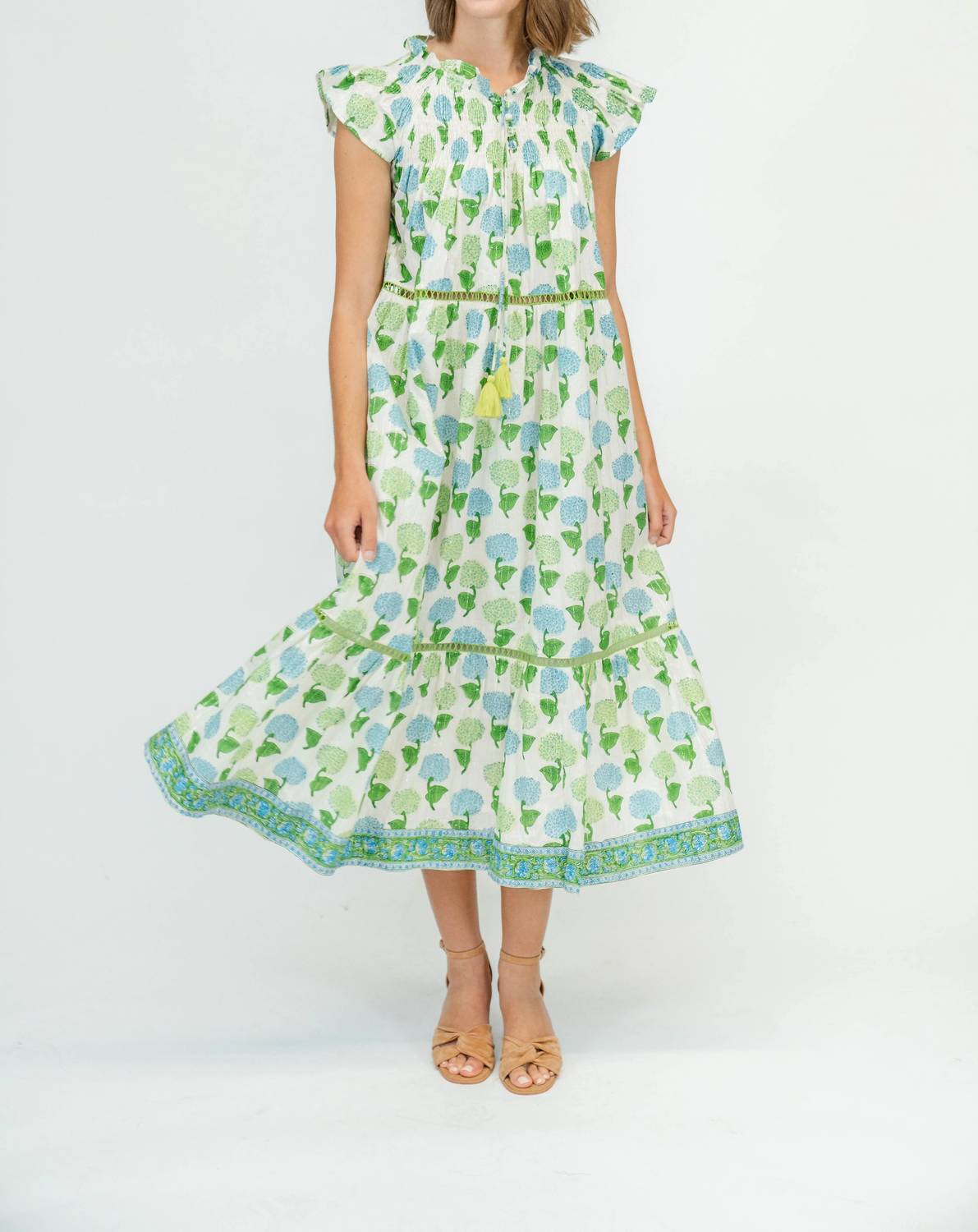 The perfect length dress does exist. Introducing the Nova Midi Dress by Clara the Label, a boho chic piece in a vibrant Blossom shade. This dress features short flutter sleeves and a v-neckline with a tassel tie closure, complemented by an elastic waist for added comfort. Lovingly hand-blocked by artisans in Jaipur, India, the dress is crafted from 100% Cotton Lurex with a lined garment finish. Care instructions include hand wash only and line dry. Madison is wearing a size medium at (5'4" height).