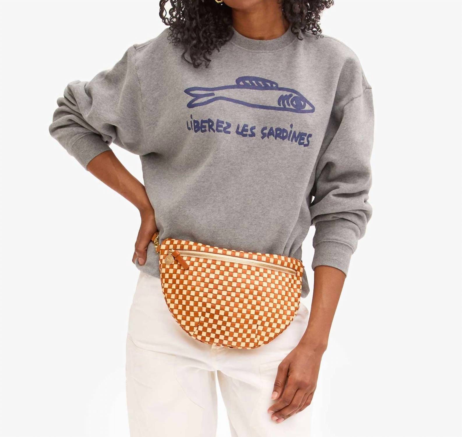 Introducing the Clare V. Cotton Sweatshirt With Sardines, a distinct conversation piece crafted from 100% cotton. This navy patterned sweatshirt, set against a subtle grey backdrop, features long sleeves and a classic crewneck. Originating in Spain, this women's sweatshirt offers a playful nod to marine life with a pull-on closure for easy wear. Care for this minimalist piece by machine washing and tumble drying, perfect for summer vacations.