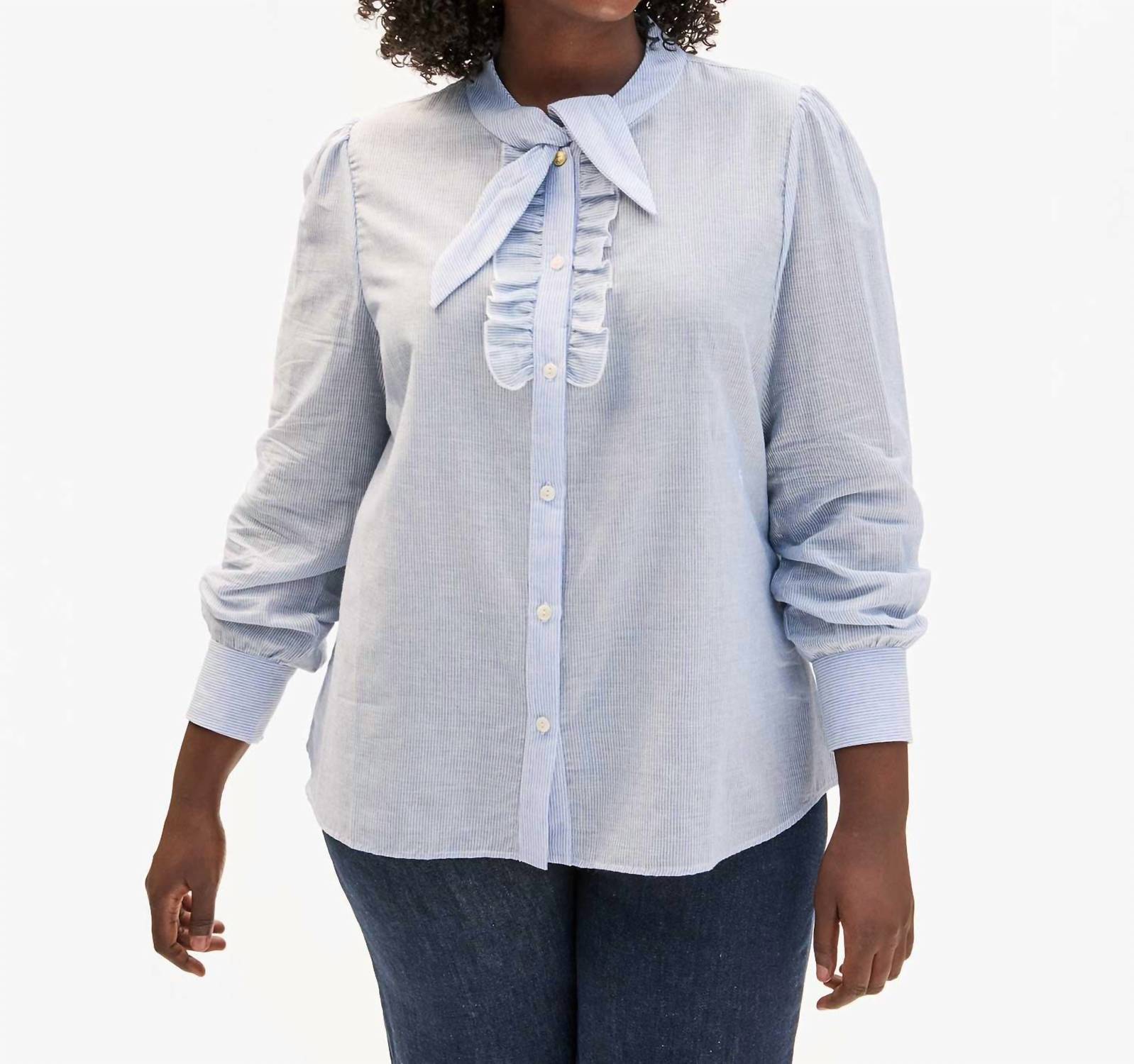 A timeless blouse that will never go out of style. Introduce a chic element to your vacation wardrobe with the Pia Ruffle Tie Blouse by Clare V. This stylish, long-sleeve blouse is crafted from 100% cotton for a textured finish in powder blue and cream, offering a minimalist vibe. It features delicate ruffles and a neck tie, complemented by a crewneck design. Closure: Button closure. Care: Hand wash and line dry for best results.