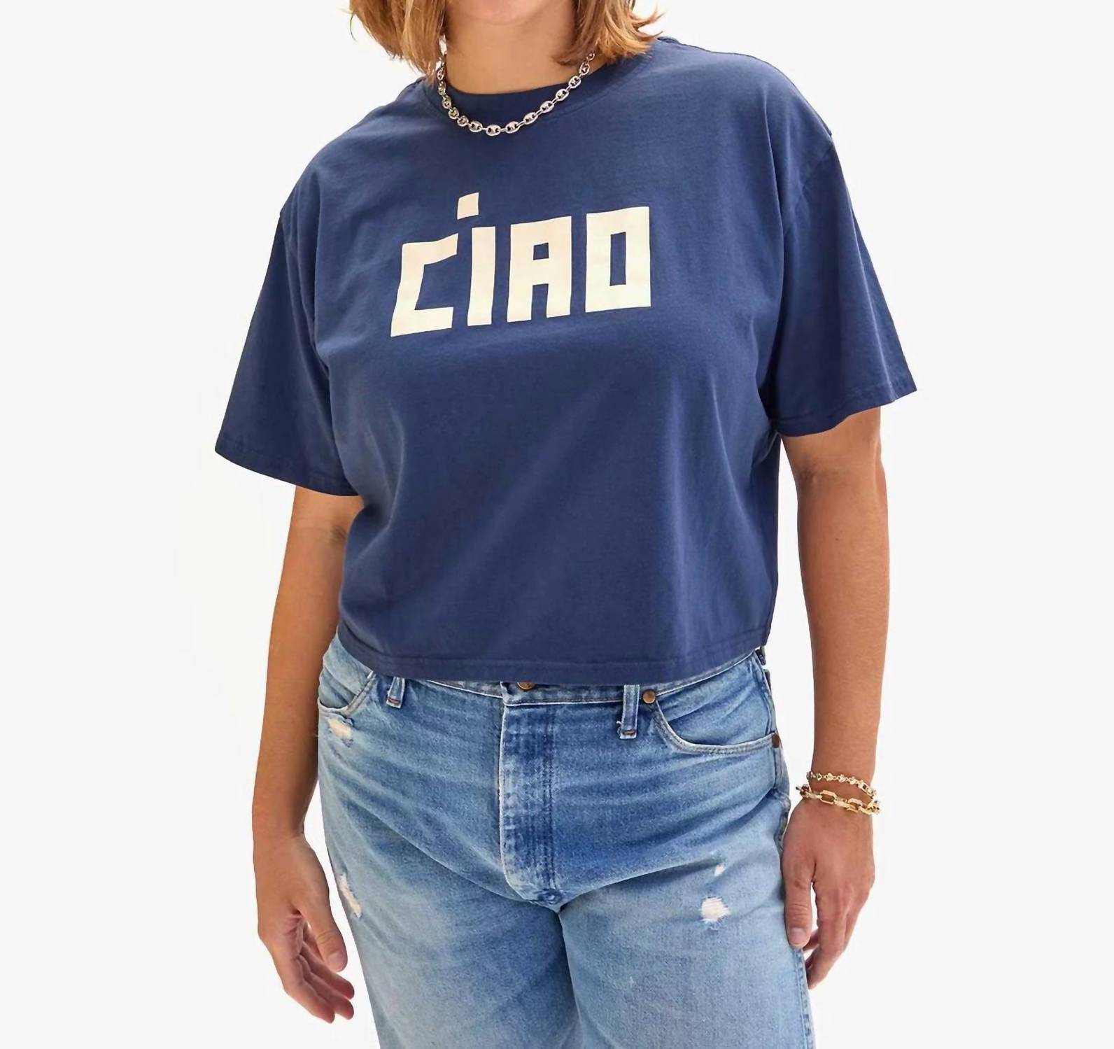 Elevate your vacation wardrobe with the Clare V. Tee With Ciao, a minimalist navy short sleeve top perfect for any casual setting. Crafted from 100% pre-shrunk cotton, this solid crewneck design ensures both comfort and style. Proudly made in Portugal, the tee features a convenient pull-on closure. For easy maintenance, simply machine wash and tumble dry.