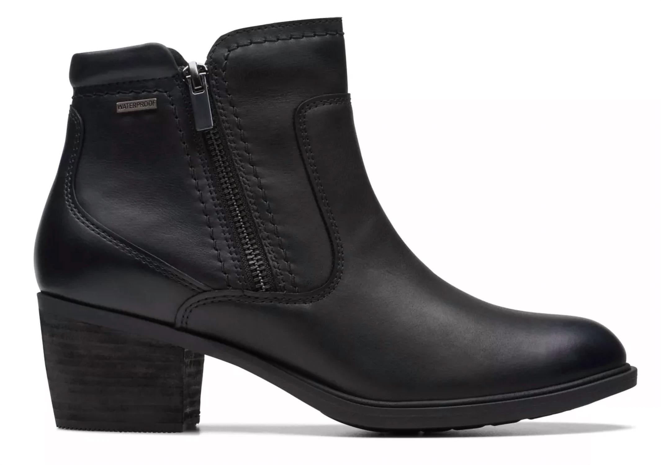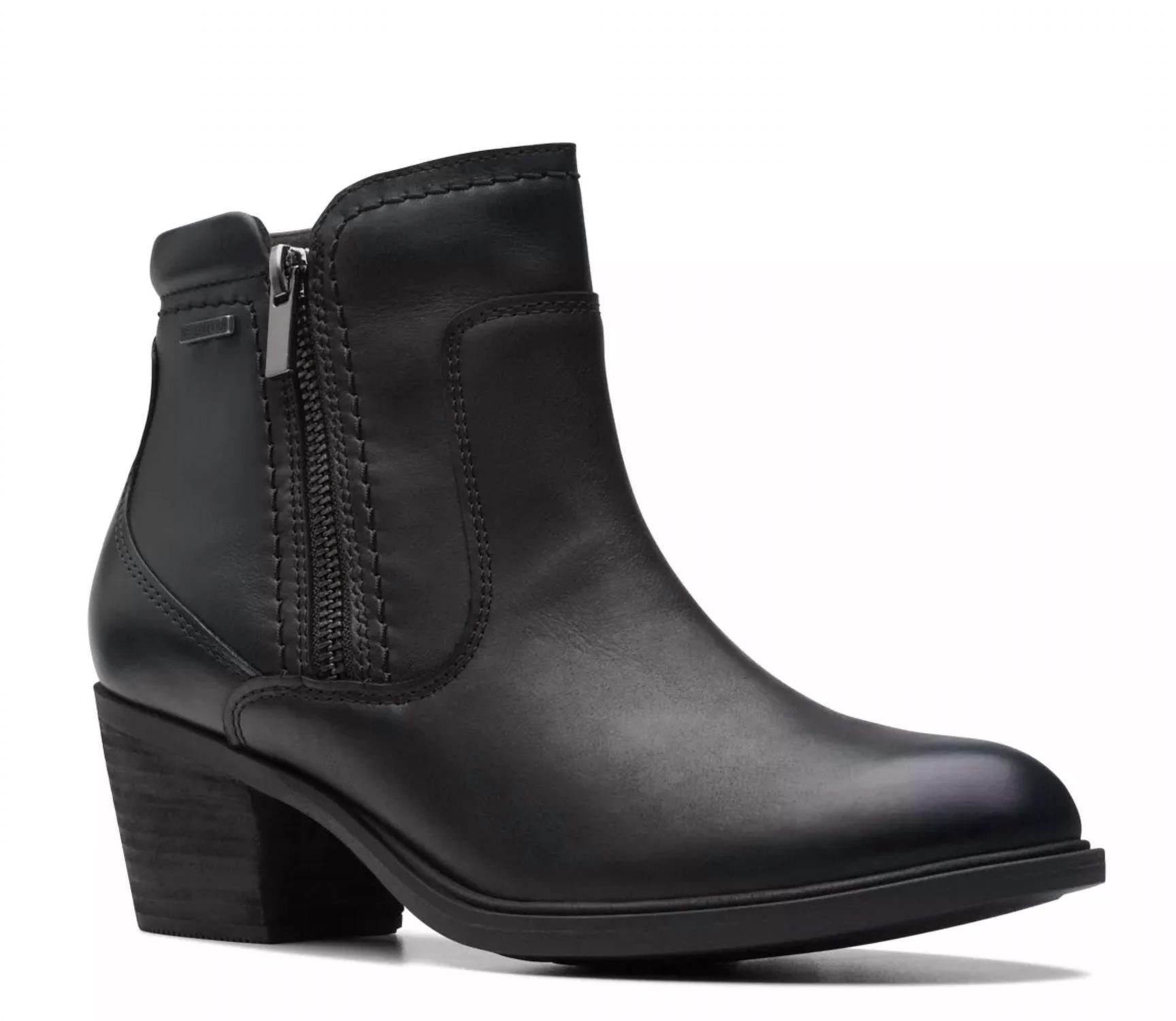 Say hello to the perfect, most versatile boot. The ankle height makes this style easily transition from day to night. Wear them with your favorite skinny jeans and tee for a more laid back look, or pair them with your favorite mini dress and jacket for a night out on the town. Step into style and comfort with the Women's Neva Zip Boot by Clarks, expertly crafted to blend a rodeo-inspired aesthetic with modern elegance. Designed in a black leather upper, this ankle boot features a convenient zip fastening, an almond toe, and a mid block heel standing at 55mm (2.165 inches) for a boost in height without compromising on comfort. Its textile lining and part-recycled moulded Contour Cushion footbed ensure all-day cushioning with every step you take. The durable, grippy TPR outsole adds the perfect finishing touch to this versatile pair, making it an excellent choice for any occasion.