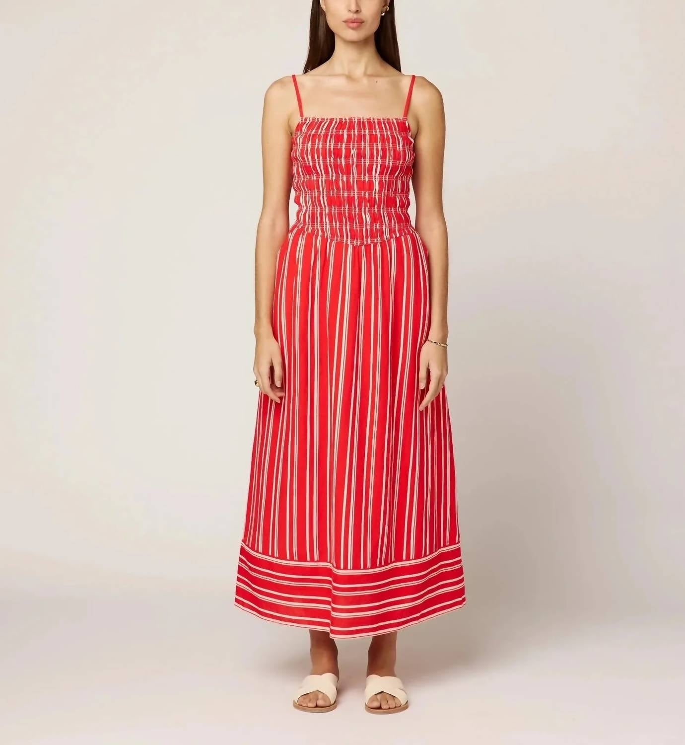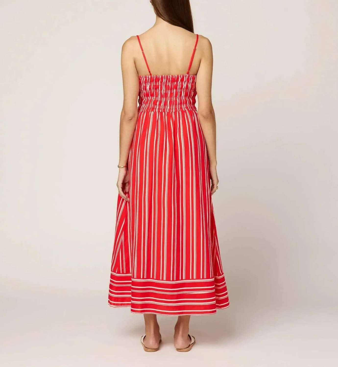 A midi dress so versatile, your options for wearing it are endless. Introducing the Lacy Ankle Dress by Cleobella, an ethically handmade piece from India crafted from a cotton linen blend. This striking poppy striped dress showcases spaghetti straps and a fit and flare silhouette with a flattering square neck smocked bodice. Its added features, including pockets and lining, make it a practical choice for any summer occasion, whether it's dressed up or down. Closure: Pull on. Care: Hand wash cold, lay flat to dry or dry clean. Model is 5'9.5" wearing size S.