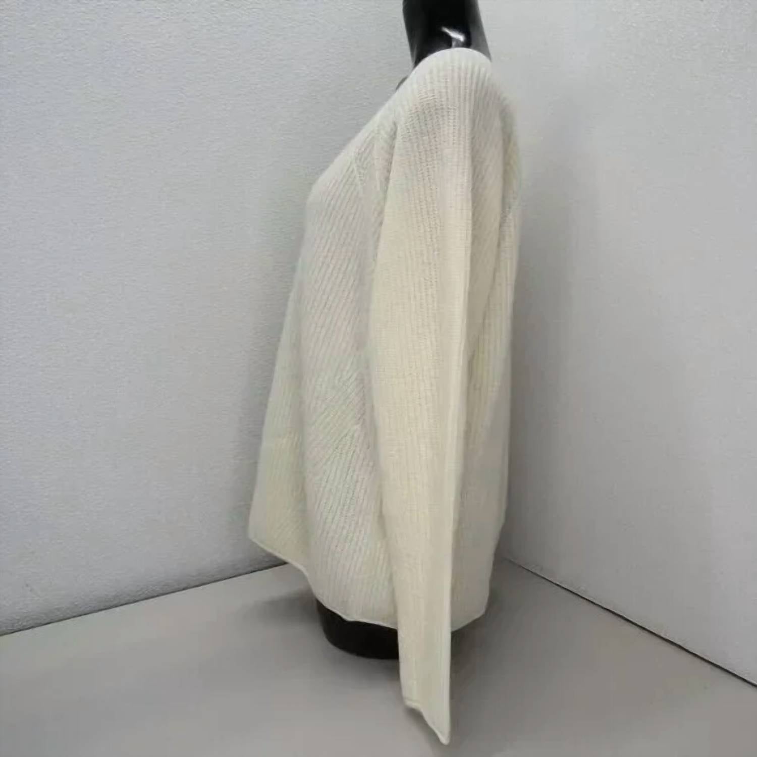 Indulge in luxurious comfort with the Club Monaco Women's Cashmere V-neck Long Sleeve Sweater in elegant ivory. Crafted from 100% ultra-soft cashmere, this pullover features a flattering V-neckline and long sleeves, making it a chic choice for layering or standalone wear. With its relaxed fit and timeless appeal, it serves as a versatile addition to any minimalist wardrobe. Care: Dry clean only.