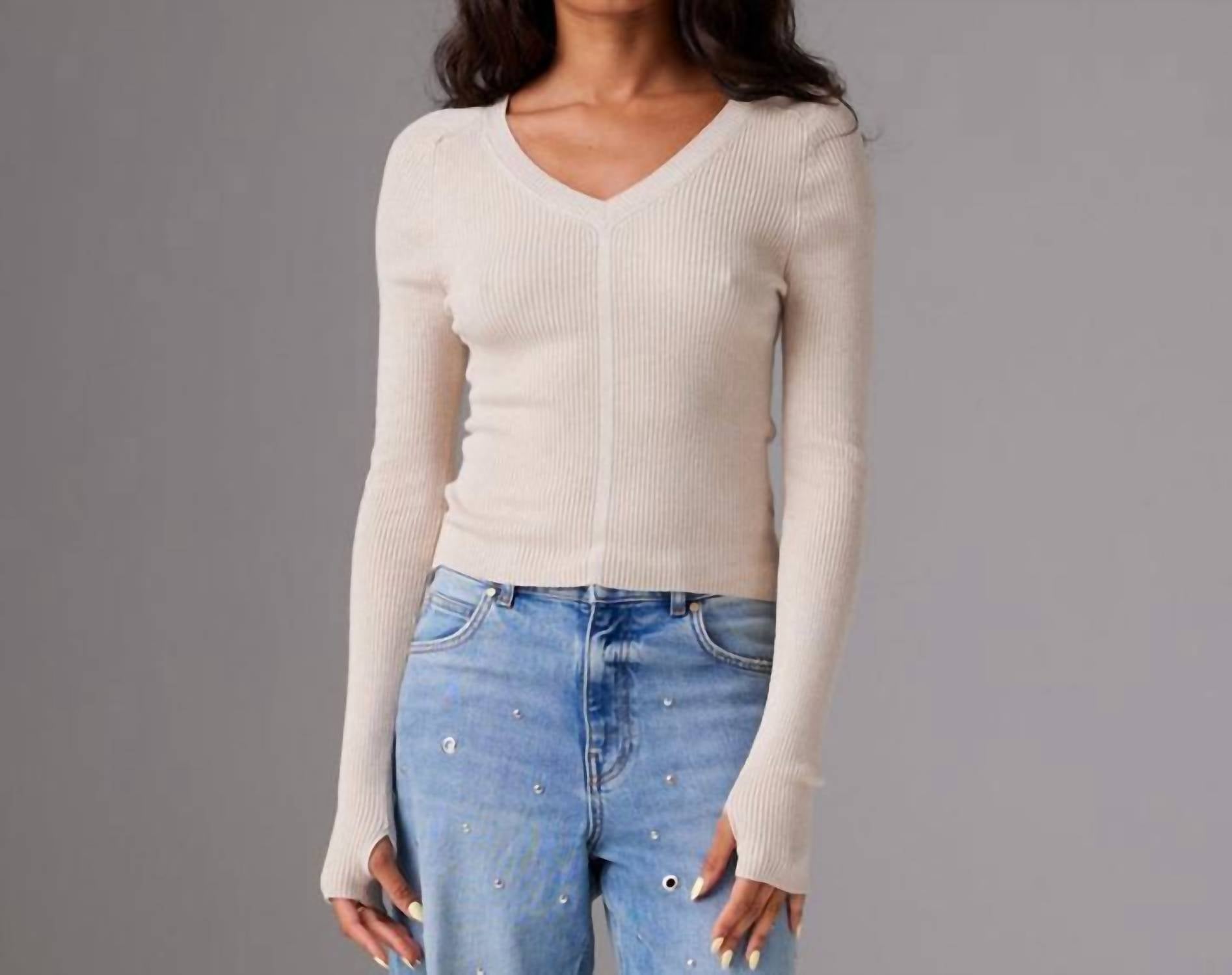 Wear this v-neck sweater with your favorite denim for the perfect fall look. Elevate your fall wardrobe with the Jones Skinny Rib V-neck Sweater by Colorush, designed for women who embrace minimalist style. This textured, long sleeve sweater comes in a serene Sail hue, crafted from a luxurious cotton blend of 70% cotton, 20% silk, and 10% cashmere. The pull-on design ensures ease and comfort, making it an ideal choice for travel. Please care for your sweater by hand washing.