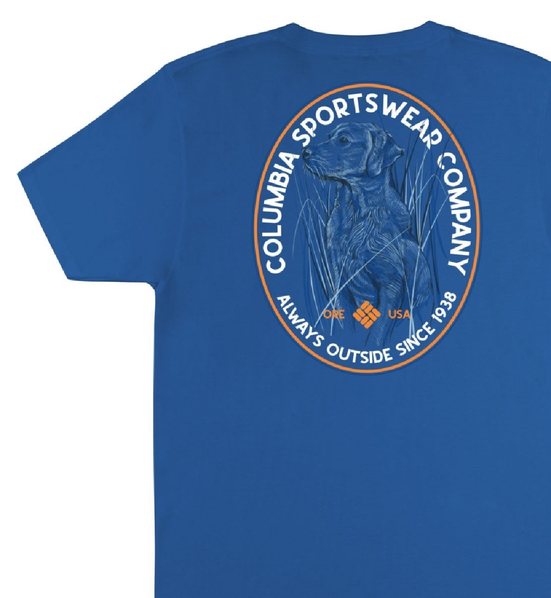 This Columbia graphic T-shirt featuring a drawing of your favorite Lab in the grass.| Crew neck| Short sleeve| Regular fit| Cotton| Machine Washable| Imported