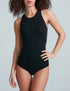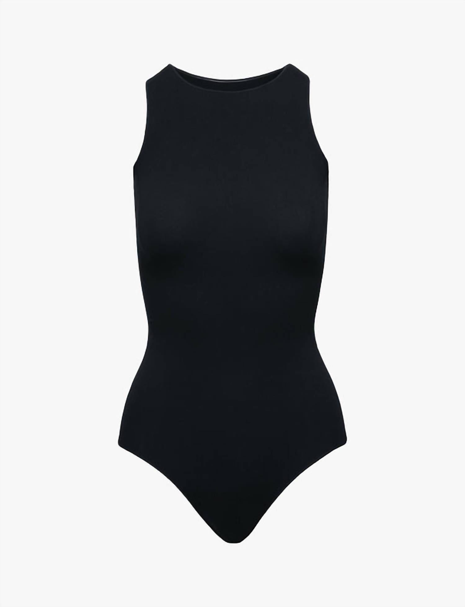 Experience the sleek and stylish Ballet Racerback Bodysuit by Commando, designed for activewear with a modern edge. This sleeveless piece, featuring a crewneck design, is crafted from premium nylon, providing a smooth, comfortable fit. Closure is made easy with a pull-on style, perfect for effortless wear. Care instructions include machine washing, offering convenience and maintaining the quality of this solid black bodysuit.
