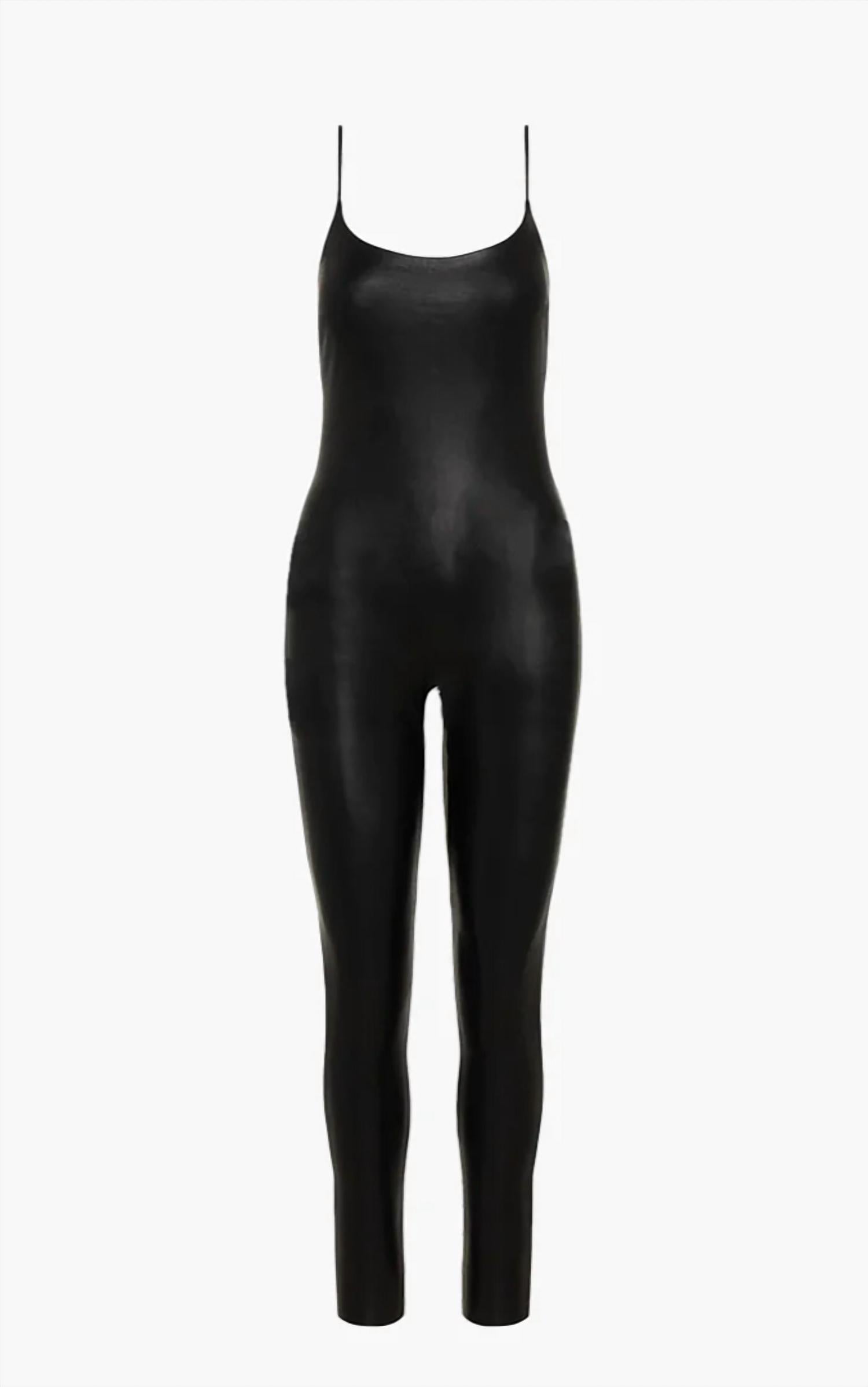 Who doesn't love a good bodysuit?Full-body catsuit silhouette. Adjustable straps. Four-way stretch faux leather body (55% polyurethane, 44% viscose, 1% elastane). Fit-tested on real women. Spaghetti straps. Bust darts. Raw-cut edges. Note: This bodysuit may feel snug when you first pull it on, but it will form to your shape within first wear. Trust us it's worth the wiggle!