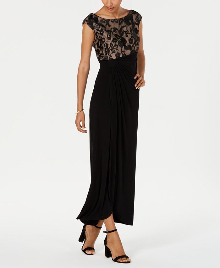 Beautifully embroidered mesh caps off this stunning faux-wrap gown from Connected| complete with a ruched design at the waist.| Approx. 57 long from center back neck to hem. Length is based on size 6 and varies 1/4 between sizes | Round neckline| Pull-on styling| Embroidered mesh bodice; ruched faux-wrap skirt
