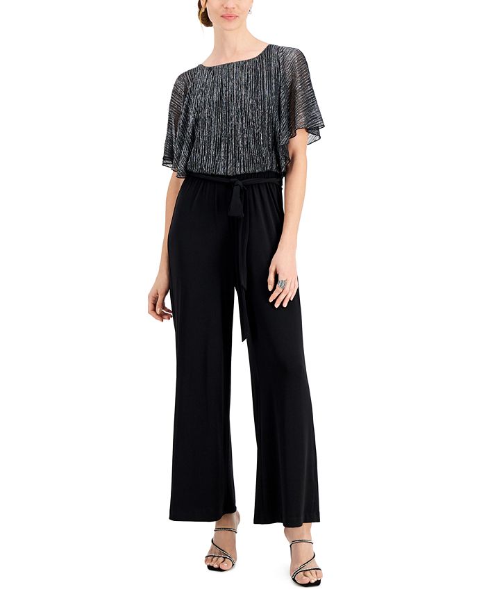 Add shimmer and shine to your next event with this shimmering overlay jumpsuit| featuring delicate flutter sleeves.| Imported| Shimmering detail at top; self-tie detail at waist| Round neckline; keyhole back closure | Flutter sleeves|