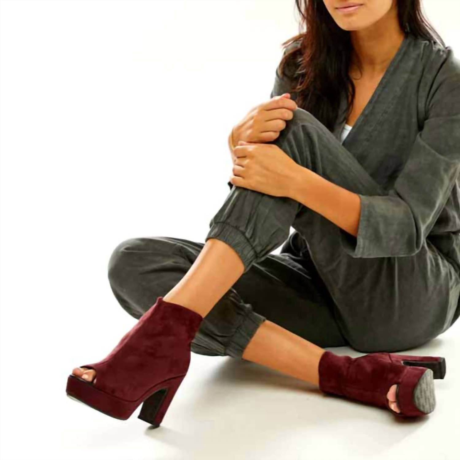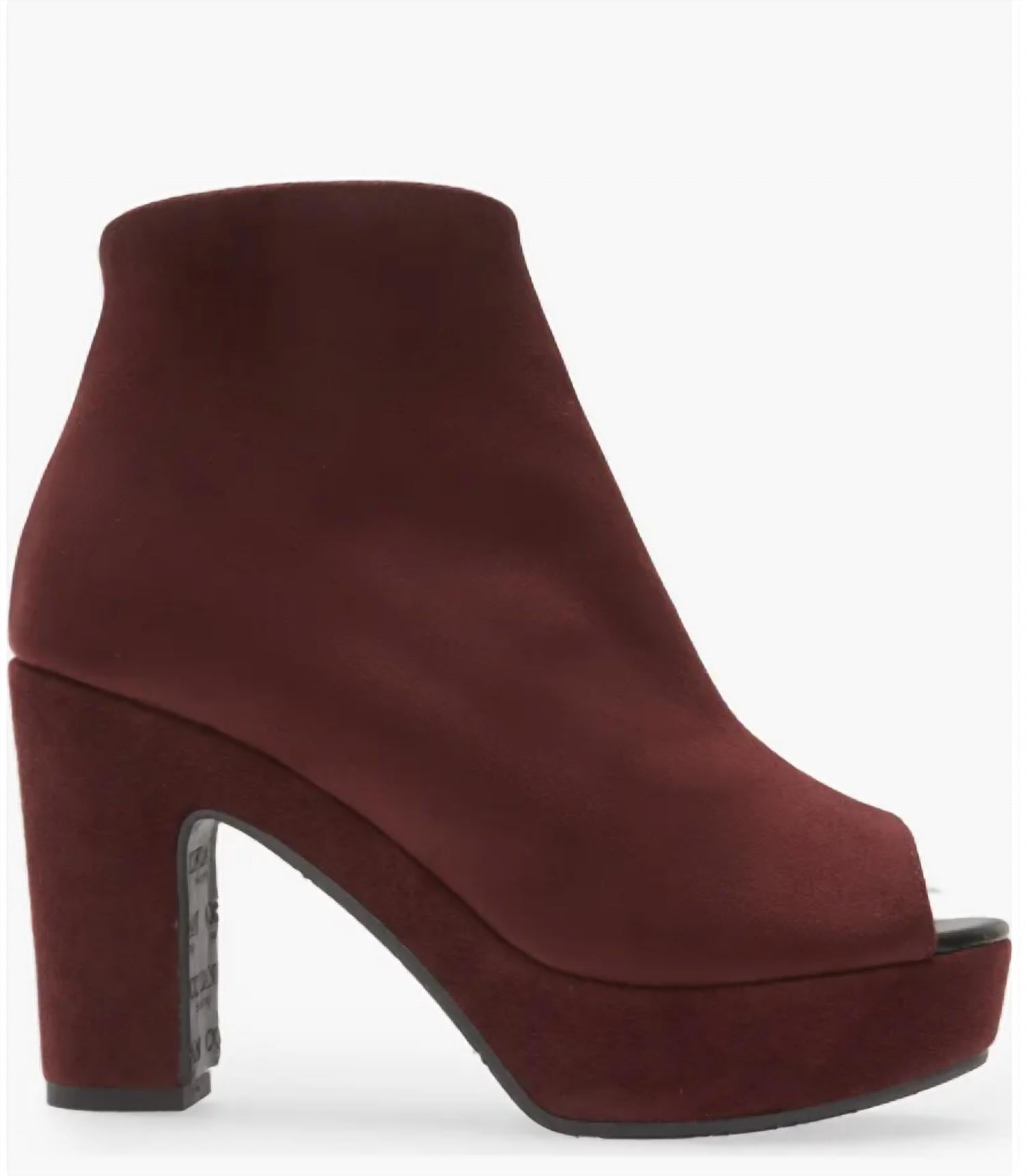 Introducing the Tyra Peep Toe Platform Bootie by CORDANI, a chic shoe crafted in luxurious bordo stretch suede. These Italian-made booties flaunt a peep toe, a stretchy shaft for easy pull-on wear, and a sophisticated curved demi-block heel that stands at a striking 4 inches high with a 1 1/2 inch platform for added elevation. Designed for style and comfort, they promise to elevate any ensemble.