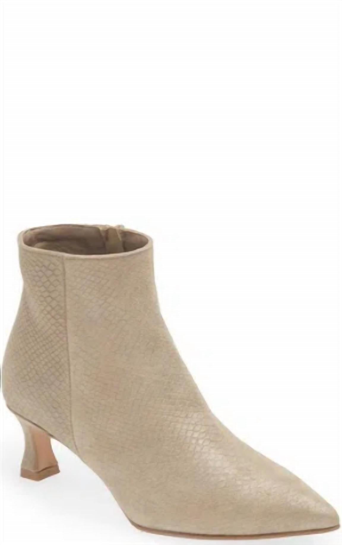 Elevate your style with the Women's Garvie Leather Boot by CORDANI, featuring a sophisticated metallic leather upper in Harley St Pitone Beige. These Italian-made ankle boots come with a chic pointed toe and a supportive kitten heel measuring 2.5 inches. The inside zipper ensures ease of wear while the lightly padded leather footbed and leather lining promise comfort. Dimensions include a shaft height of 5 inches, and the boots are finished with a durable synthetic sole.