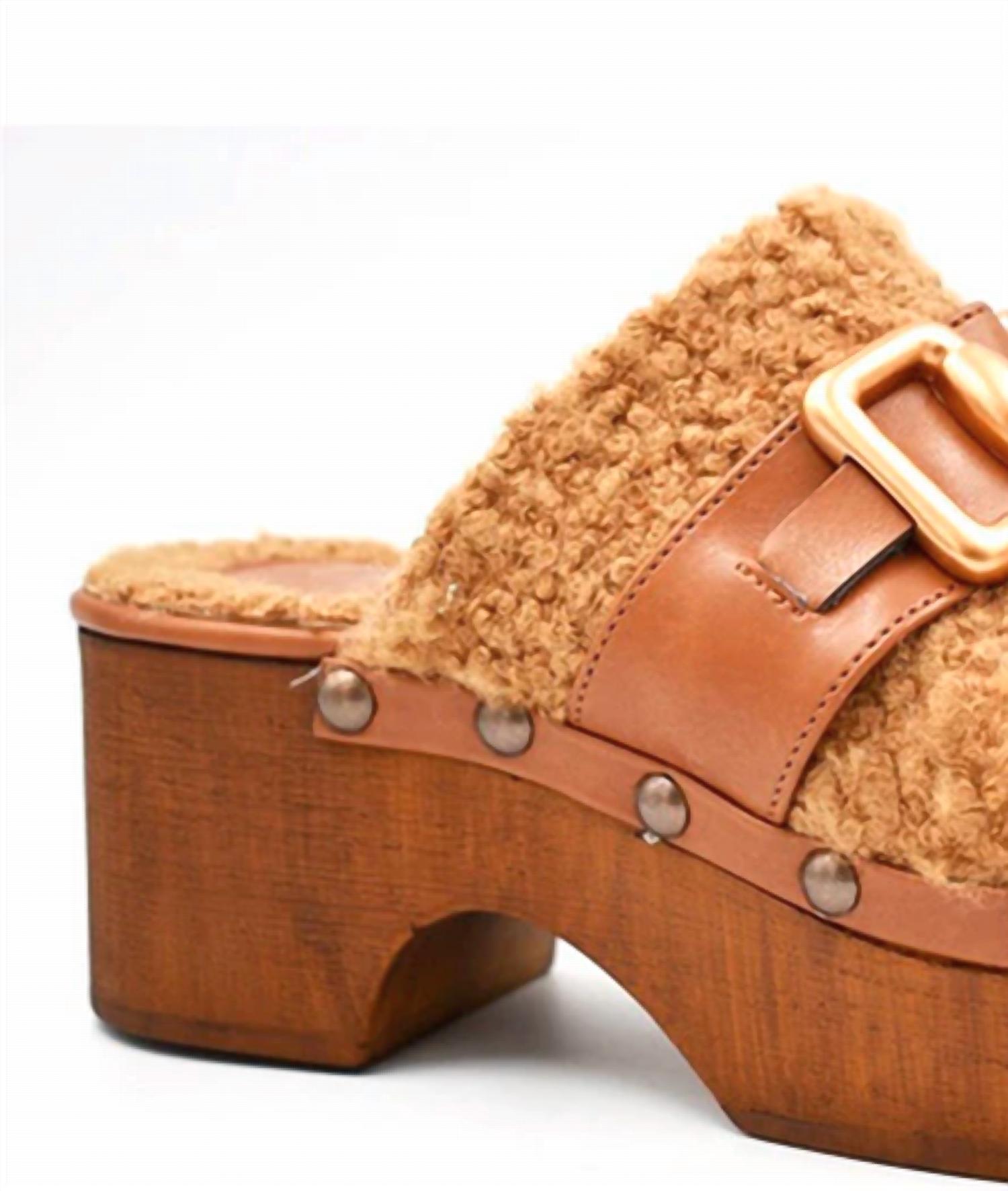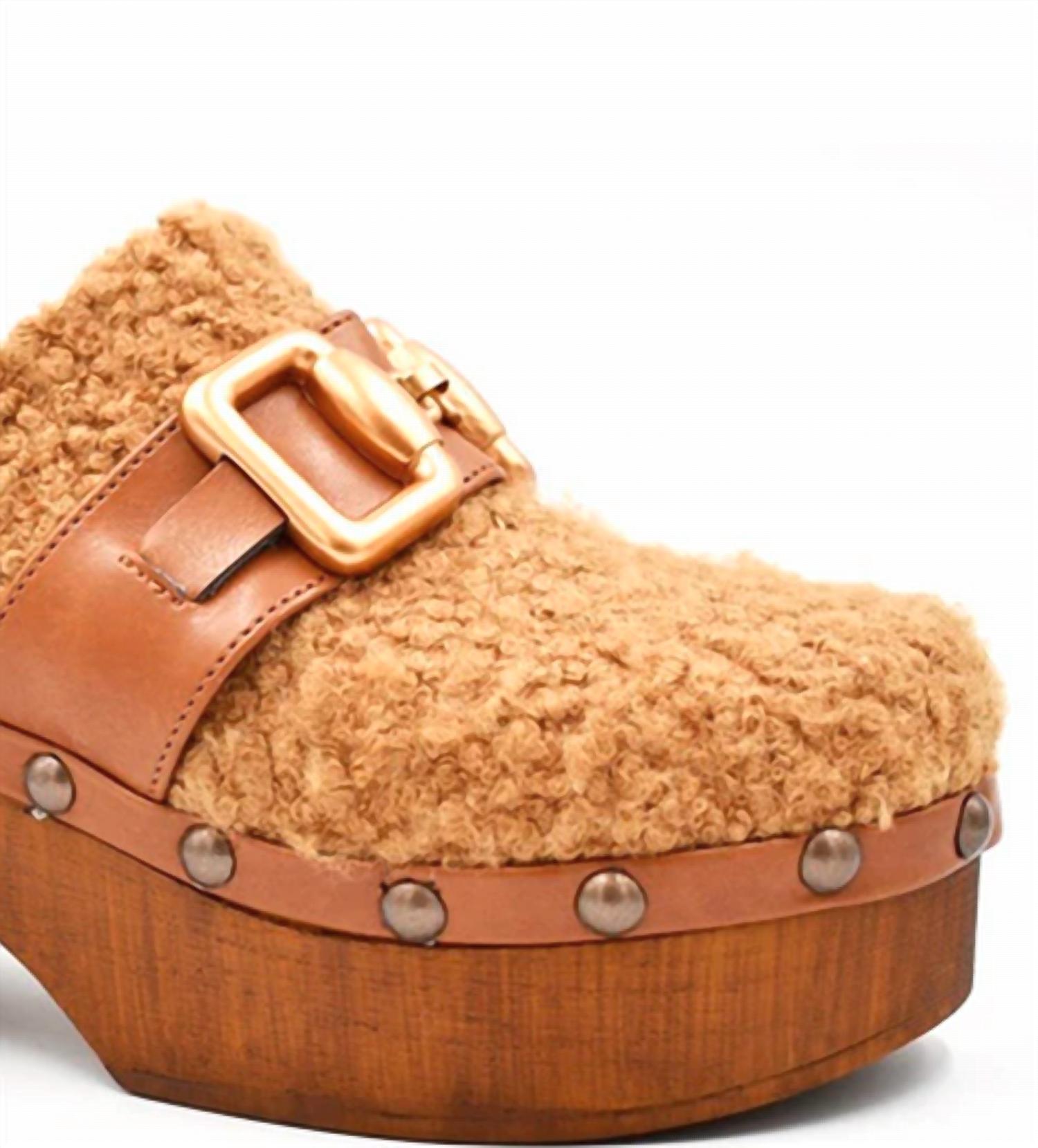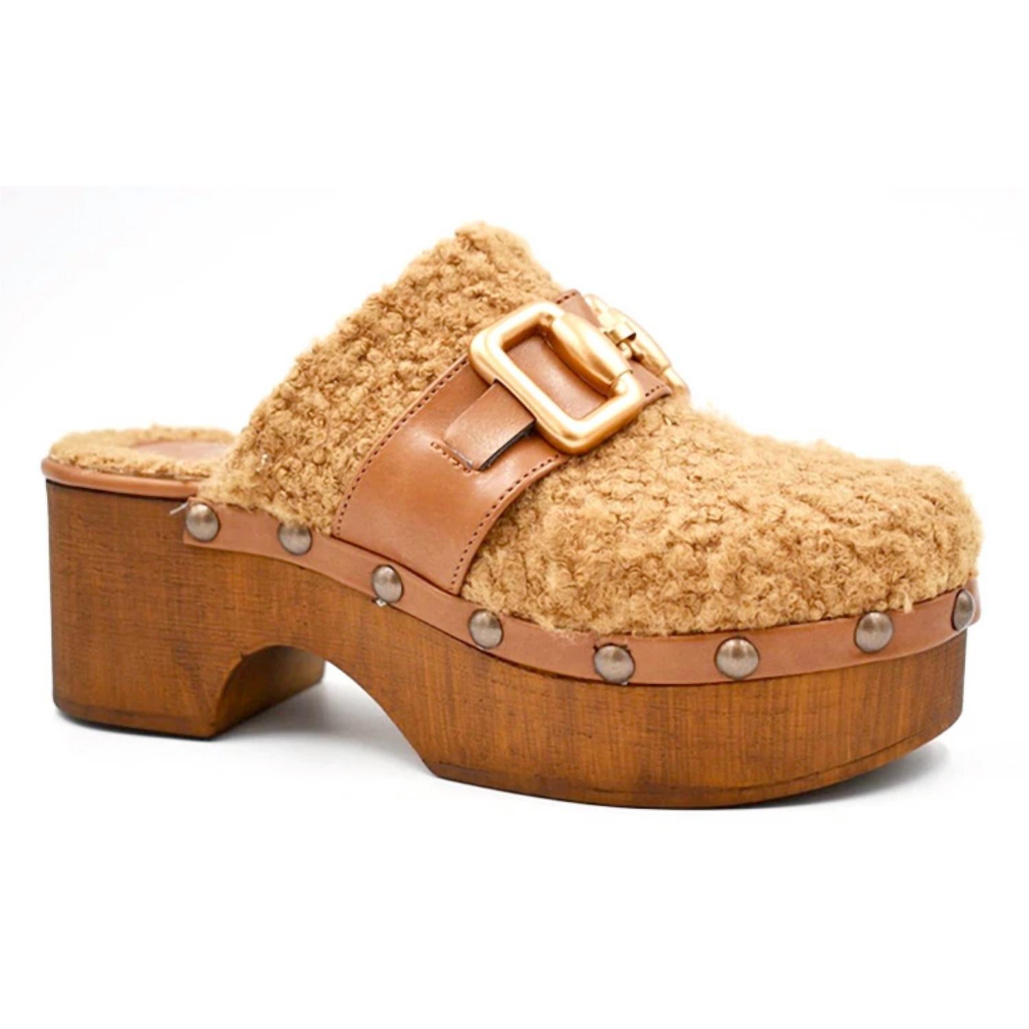 A trend that everyone is loving and this style might just be our favorite. Step into sophisticated style with the Women's Winona Bit Clogs by CORDANI, perfect for a minimalist holiday party look. These cuoio-colored clogs feature a faux shearling upper with a matching buckle and stud detail on a wood-like platform heel. Made in Italy, they boast a lightly padded footbed, leather lining, and a rubber sole for comfort and durability. With a heel height of 2.75 inches and a platform height of 1.75 inches, they offer a chic lift while ensuring all-day comfort.