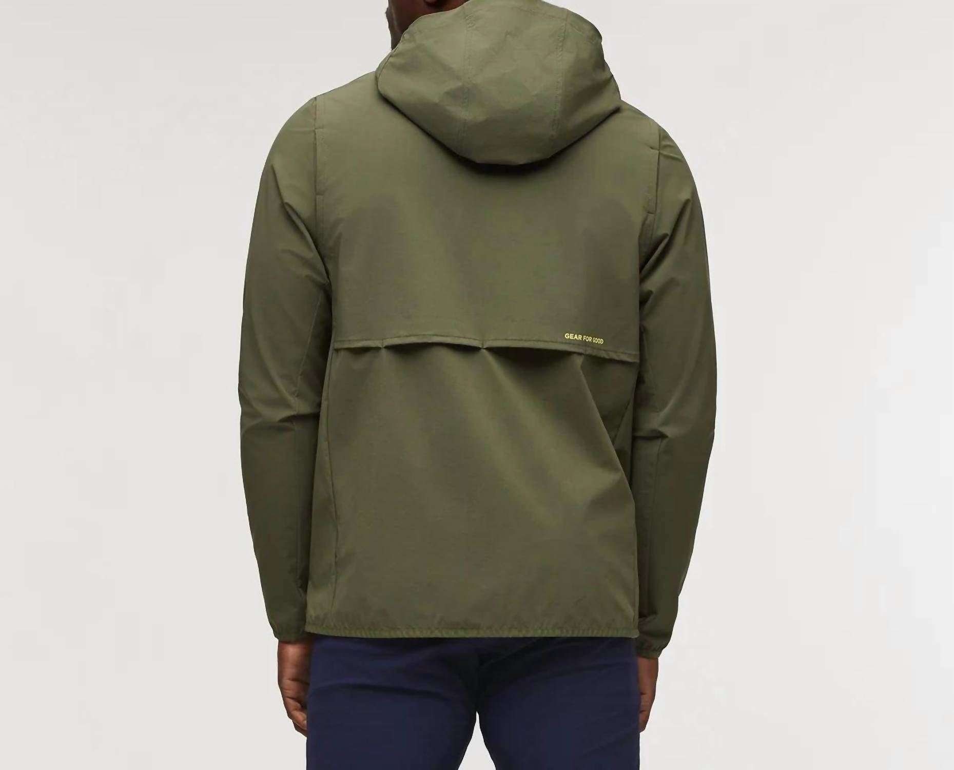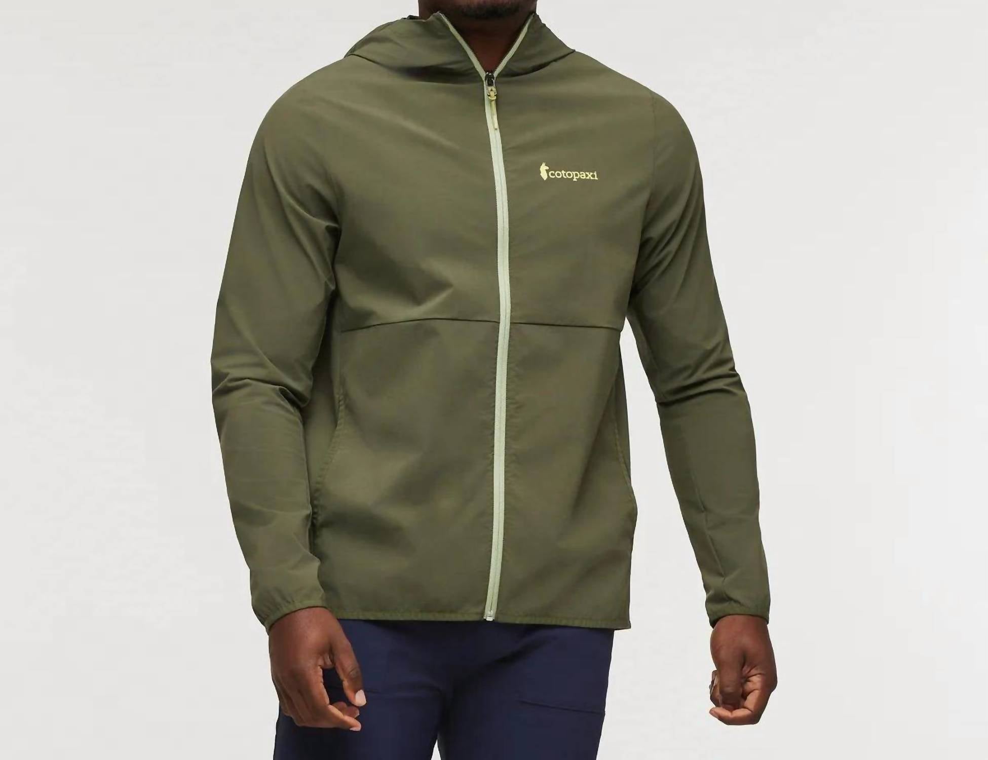 Introducing the Vuelta Performance Windbreaker Jacket by Cotopaxi in a stylish Fatigue color, perfect for men's travel and streetwear occasions. This long sleeve performance jacket is crafted from a nylon blend with a shell composition of 86% recycled nylon and 14% spandex, offering durable yet lightweight wear at 137gsm. Effortlessly packable, it features a zip closure, convenient pockets, and back and shoulder vents for enhanced breathability. Care instructions recommend machine washing to maintain its functionality season after season.