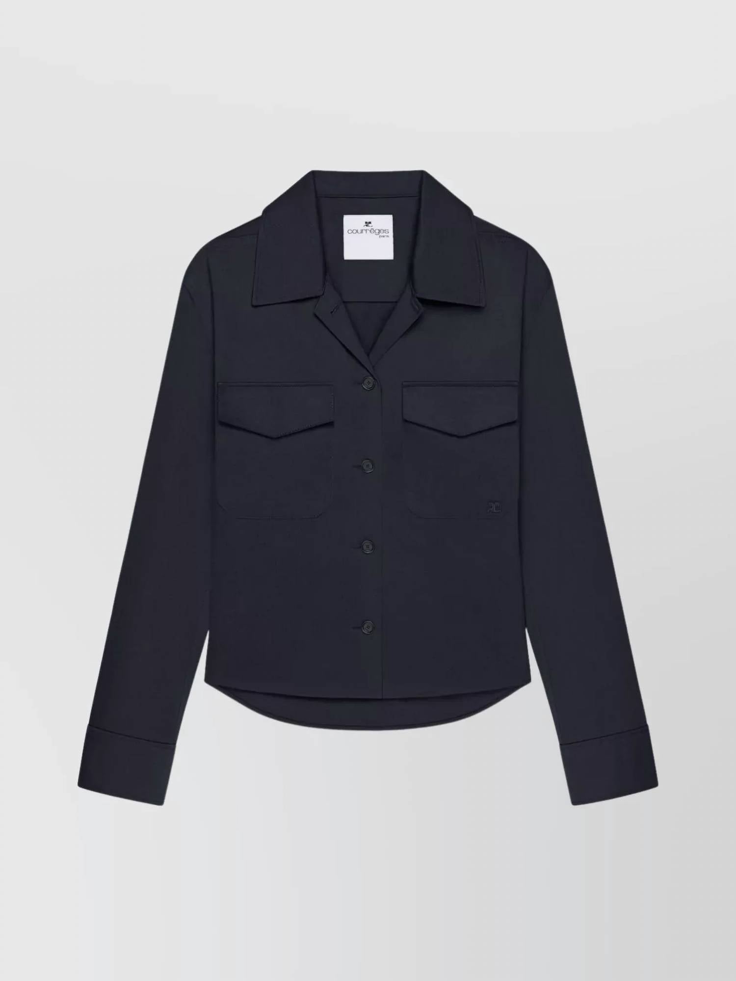 Elevate your wardrobe with the Utility Polycotton Shirt by Courrèges, a French fashion statement blending structure with allure in a sophisticated navy hue. Crafted with 65% polyester and 35% cotton, this long sleeve shirt features a button closure and chic button cuffs. Two front chest pockets adorned with a tonal Courrèges logo add a trendy touch. Made in Portugal, it requires dry cleaning, ensuring it remains impeccable through every wear.