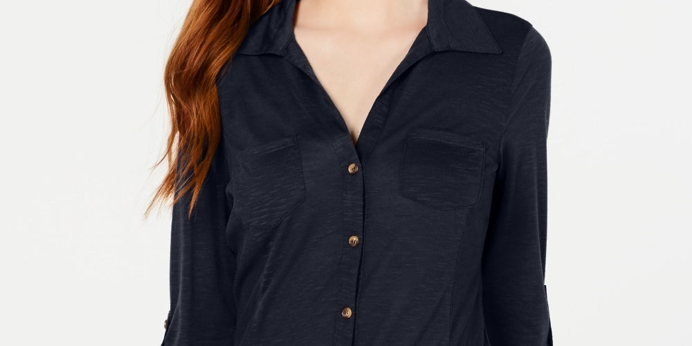 Relaxed fit; hits at hip|V-neck with point collar; front button closures|Two chest pockets|3/4 sleeves with button roll tabs|Runs small, we suggest sizing up for the perfect fit