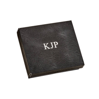 An 8 oz stainless steel flask, encased in black leatherette. Includes two matching shot glasses and a striking gift box with cover. Easy to clean and maintain, ensuring long-lasting enjoyment.