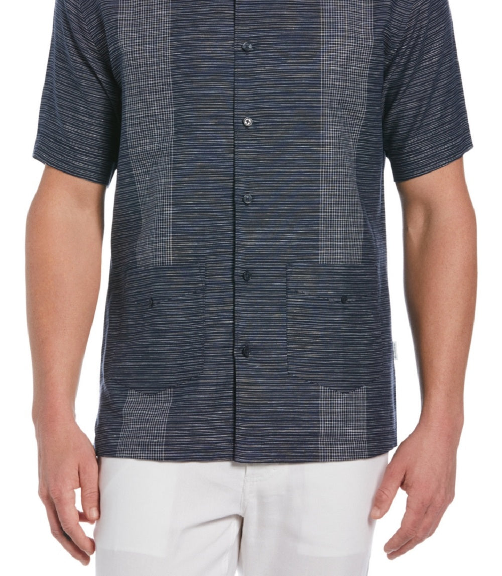 Two bottom pockets add timeless Guayabera style to this short-sleeve button-down shirt from Cubavera. Pair it with a pair of linen pants and your favorite slides for a cool casual look that stands out.| Regular fit| Point collar| Horizontal space dye panels; two bottom pockets| Linen/cotton| Machine washable| Imported