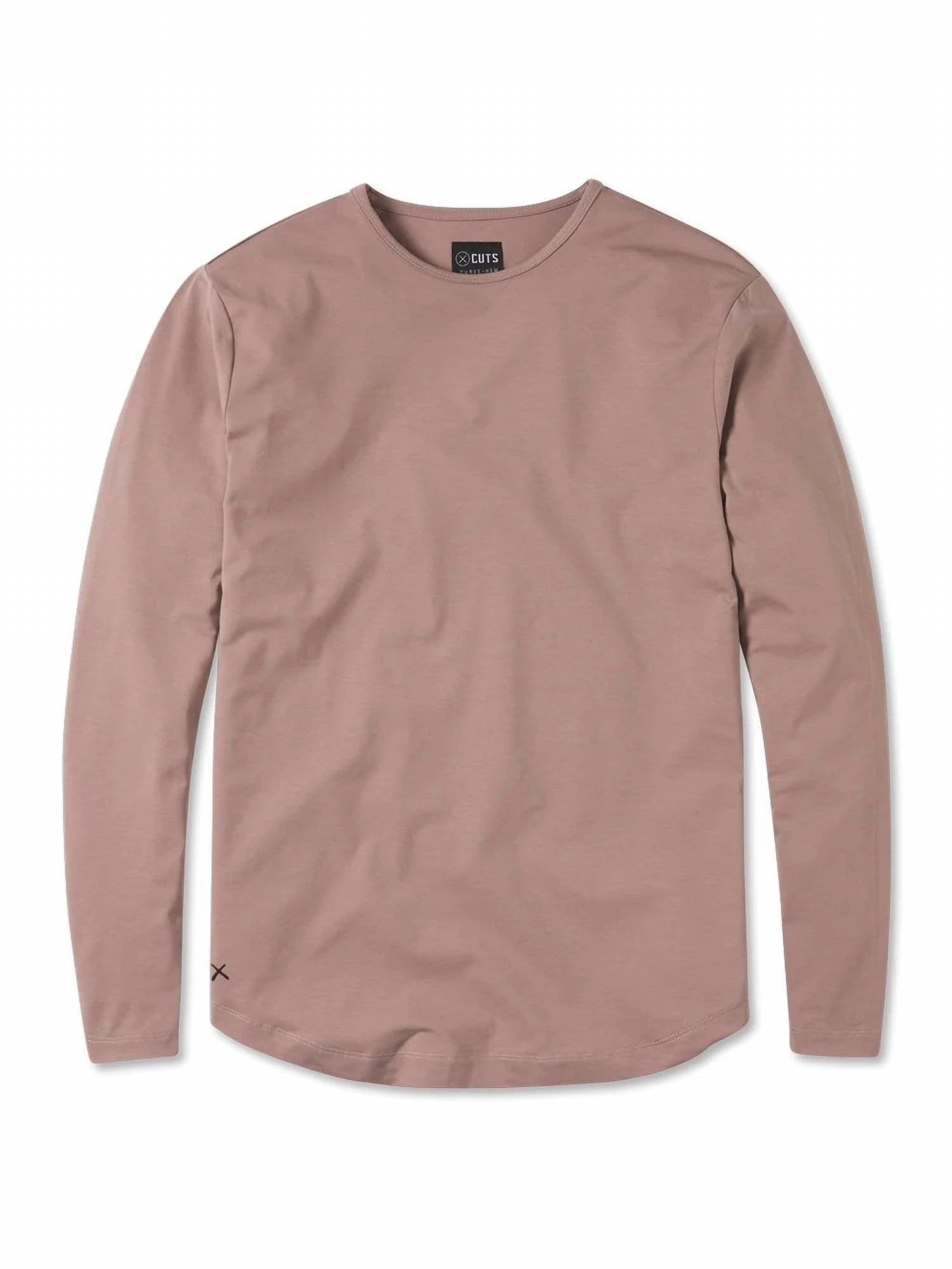 Introducing the Mountain Mist Ao Long Sleeve Curve Hem Tee by CUTS, a minimalist essential for your spring wardrobe. Tailored for a contoured, fitted look, this solid crewneck tee eliminates waist bunching with its average torso length and elevated curve hem. Crafted from a blend of 62% polyester, 33% cotton, and 5% spandex, it offers a comfortable and natural fit. Care: Machine wash cold with like colors, tumble dry low. Closure: Pull-on style.