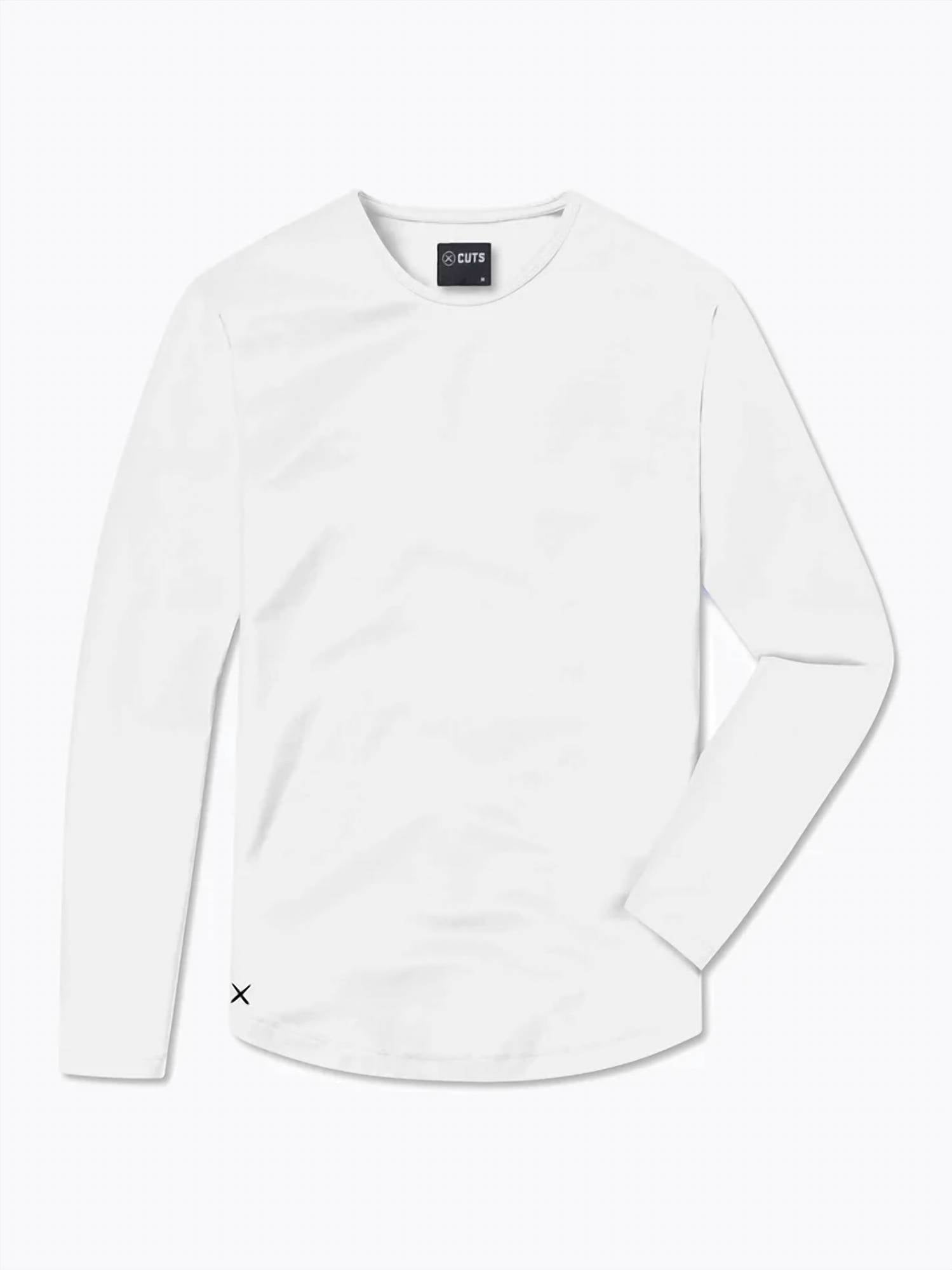 The Ao Long Sleeve Curve Hem Tee by CUTS, designed for men, offers a sleek minimalist look with its solid white, crewneck style. Featuring long sleeves and a tailored fit with a unique curve-hem, it ensures a contoured, bunch-free wear. Made from a blend of 62% polyester, 33% cotton, and 5% spandex, this tee provides comfort and durability. Closure is a convenient pull-on, and it's easy to care for with machine wash cold and tumble dry low instructions. Perfect for spring travel occasions.