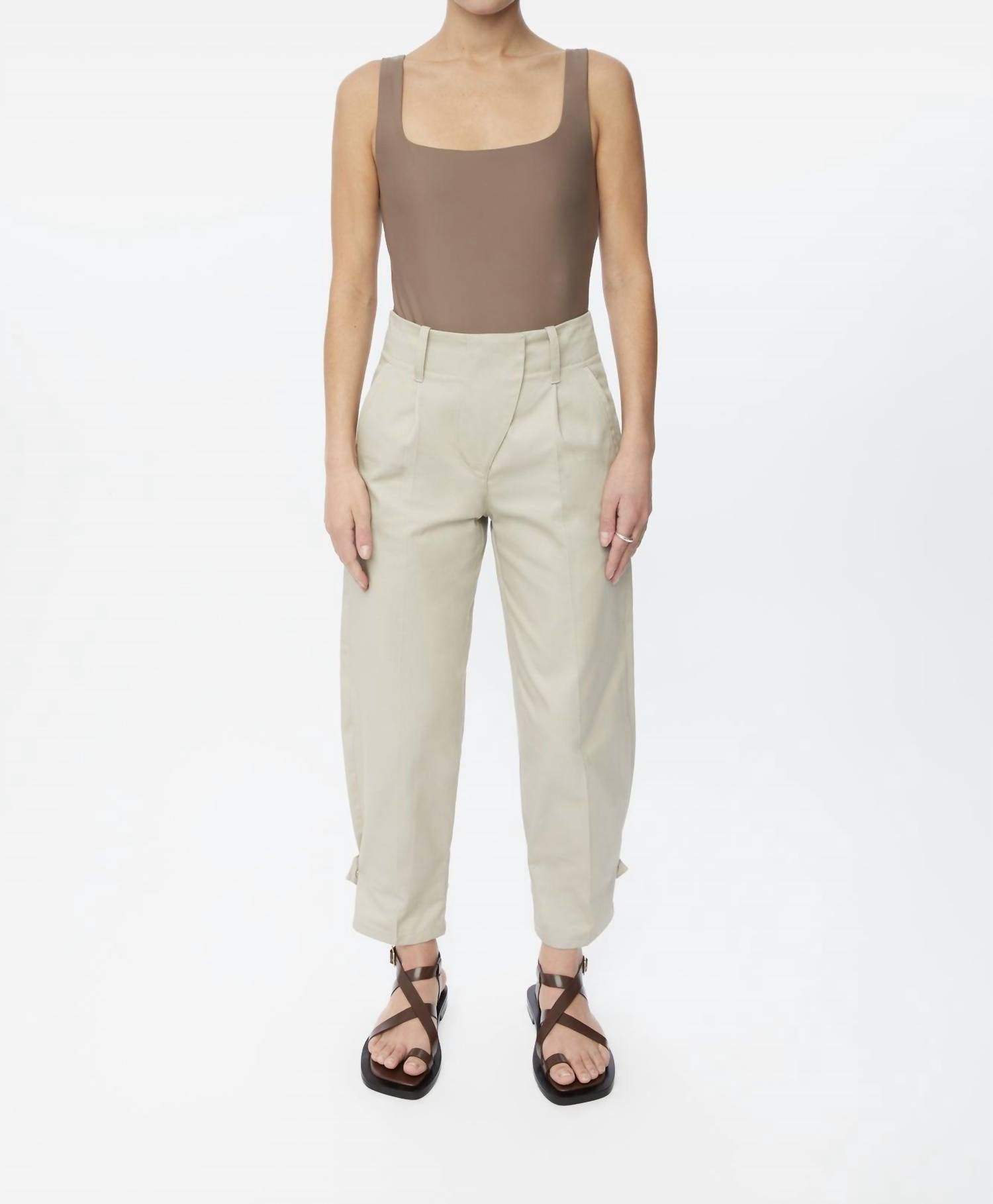 The perfect casually cool capri pant. Step into style with the Canvas Utility Tapered Pants by Dāl the Label, crafted in a solid canvas cotton twill for a minimalist look in stone. Featuring a high rise with a hook and eye closure, these pants are designed for confident versatility, complete with belt loops and functional pockets. The tapered leg style, paired with a roomy fit and hidden snap button closures at the cuffs, ensures spacious comfort. Care instructions recommend hand washing and allow for tumble drying, making these pants a practical choice for your spring vacation wardrobe.