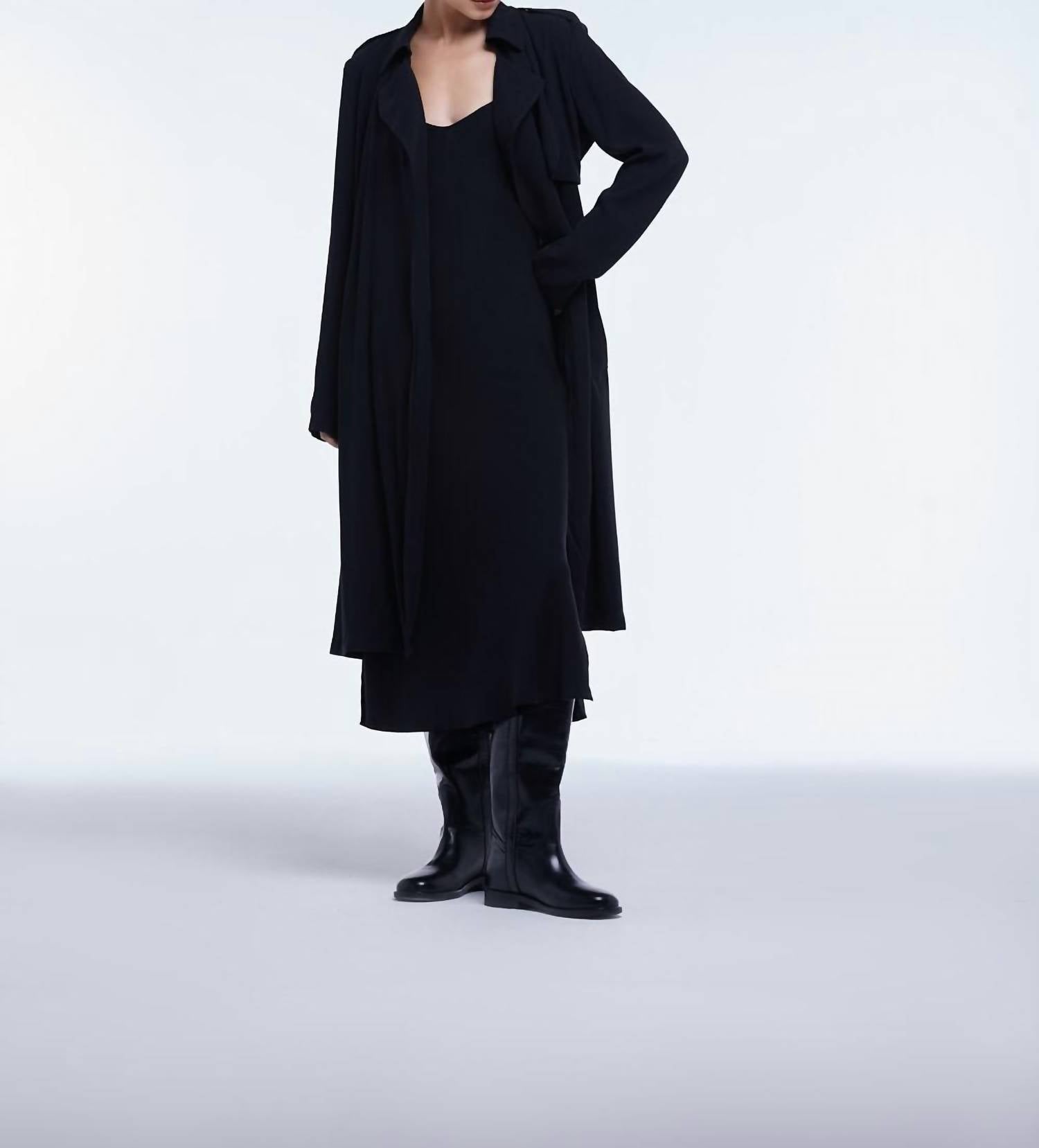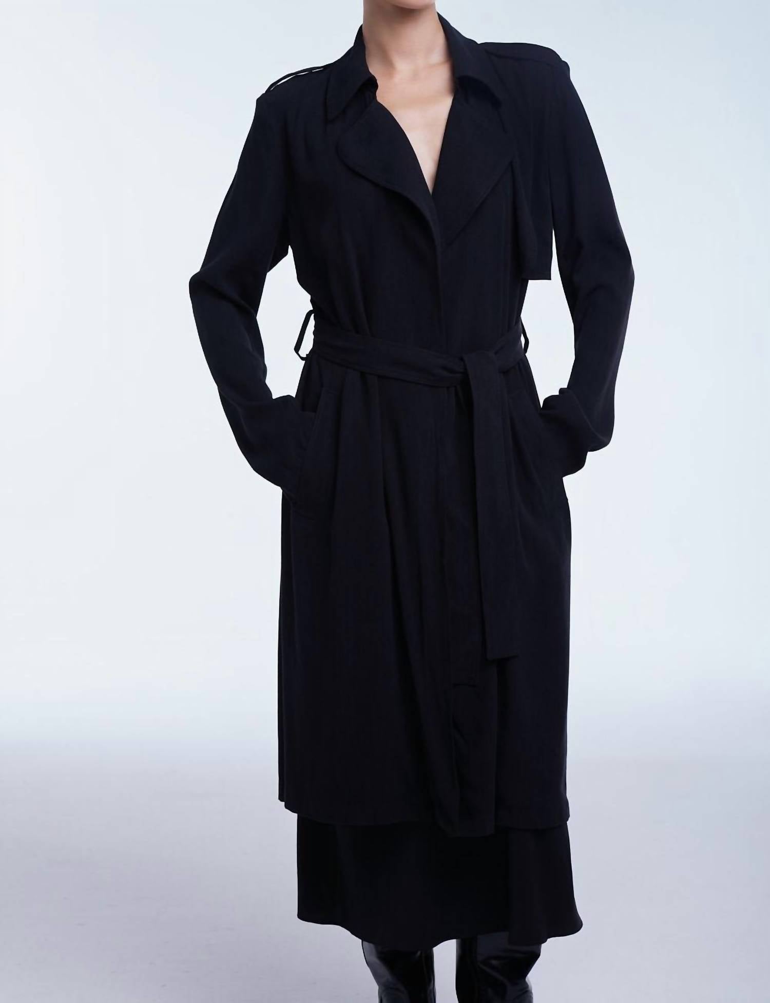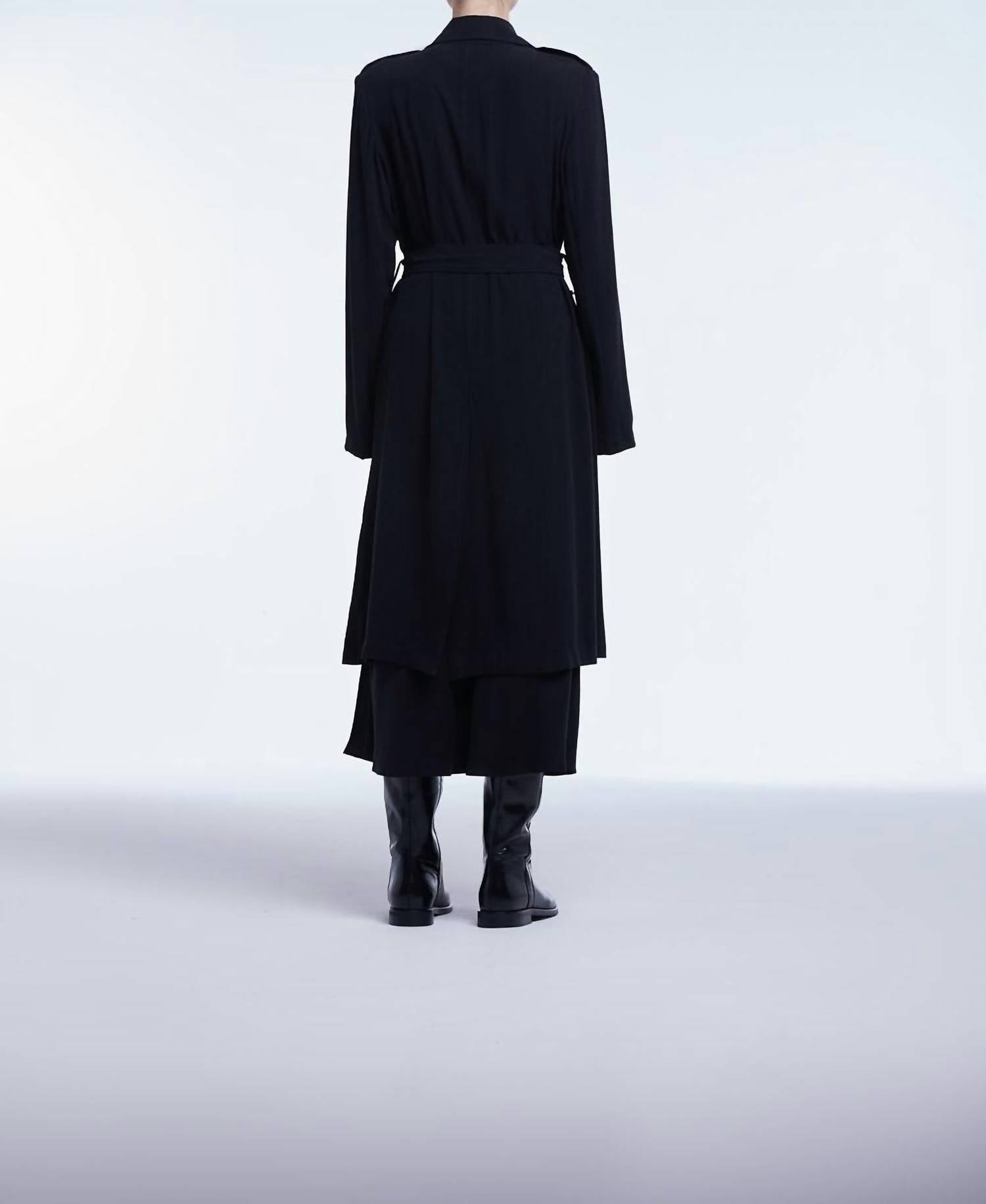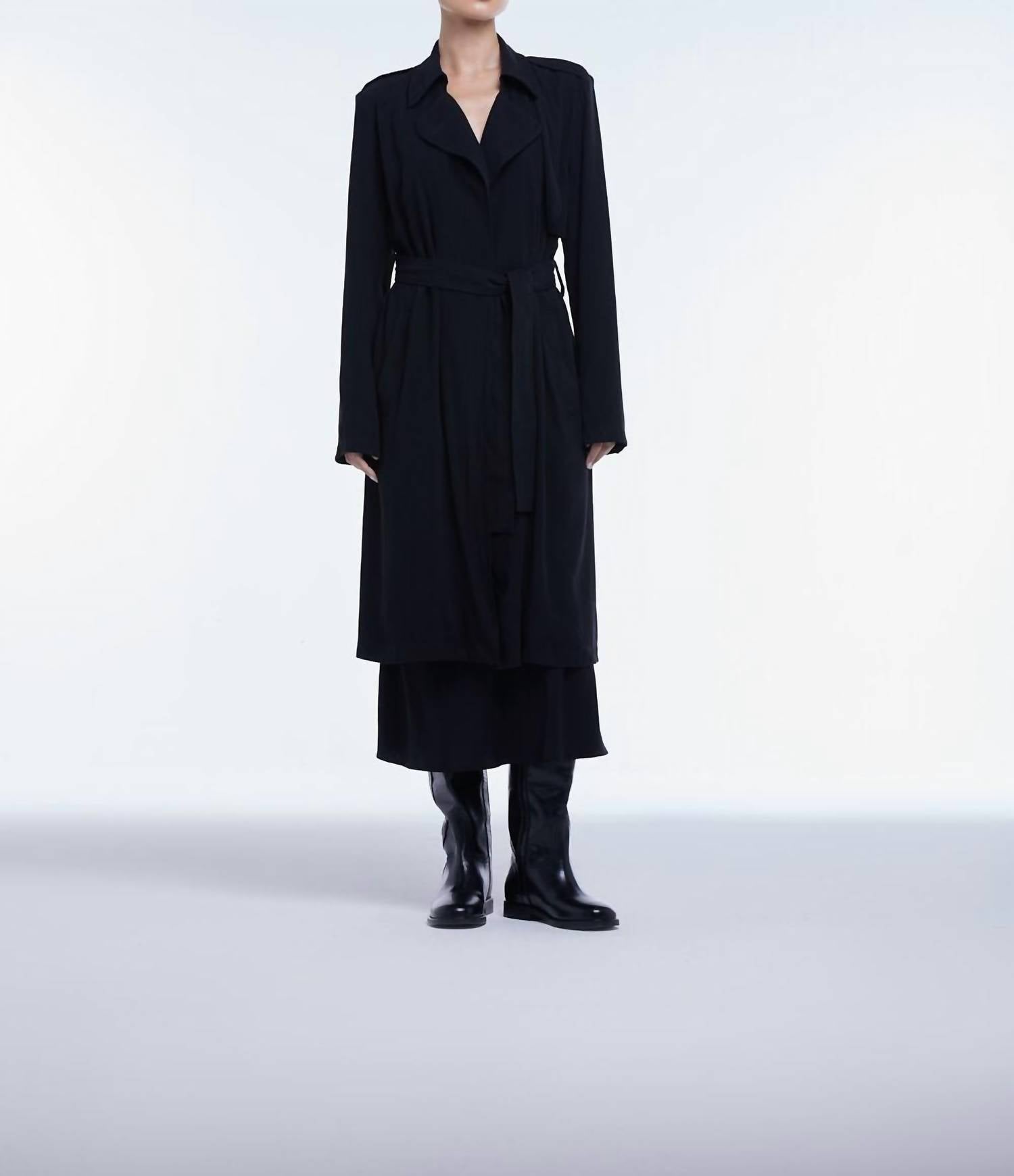 Introducing the Flowy Lapel Trench Coat by Dāl the Label, a seasonless essential in elegant black. This long sleeve coat features a double-breasted design with a classic pointed collar and is complemented by a buckle belted waist. With hip and welt pocket details, it offers both style and functionality. Closure: Tie closure. Care: Dry clean only. Perfect for spring evening events.