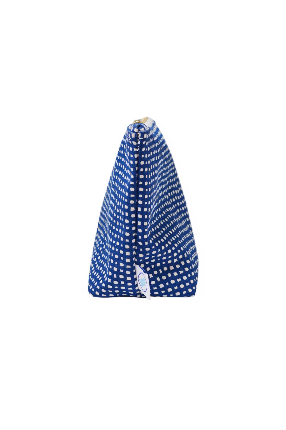 This zipper bag strikes the perfect balance between spacious and compact, offering plenty of room for your essentials without taking up your entire suitcase. Made from 15 oz cotton canvas, it features a hand-drawn circle pattern screen printed in Navy. The bag is lined with organic cotton and measures approximately 10.5" x 7" with a 4" gusset bottom for extra depth. A brass zipper closure ensures security and the screenprinting uses eco-friendly, non-toxic ink. Spot clean is preferred, and hand wash only (do not bleach). Handmade in the USA.