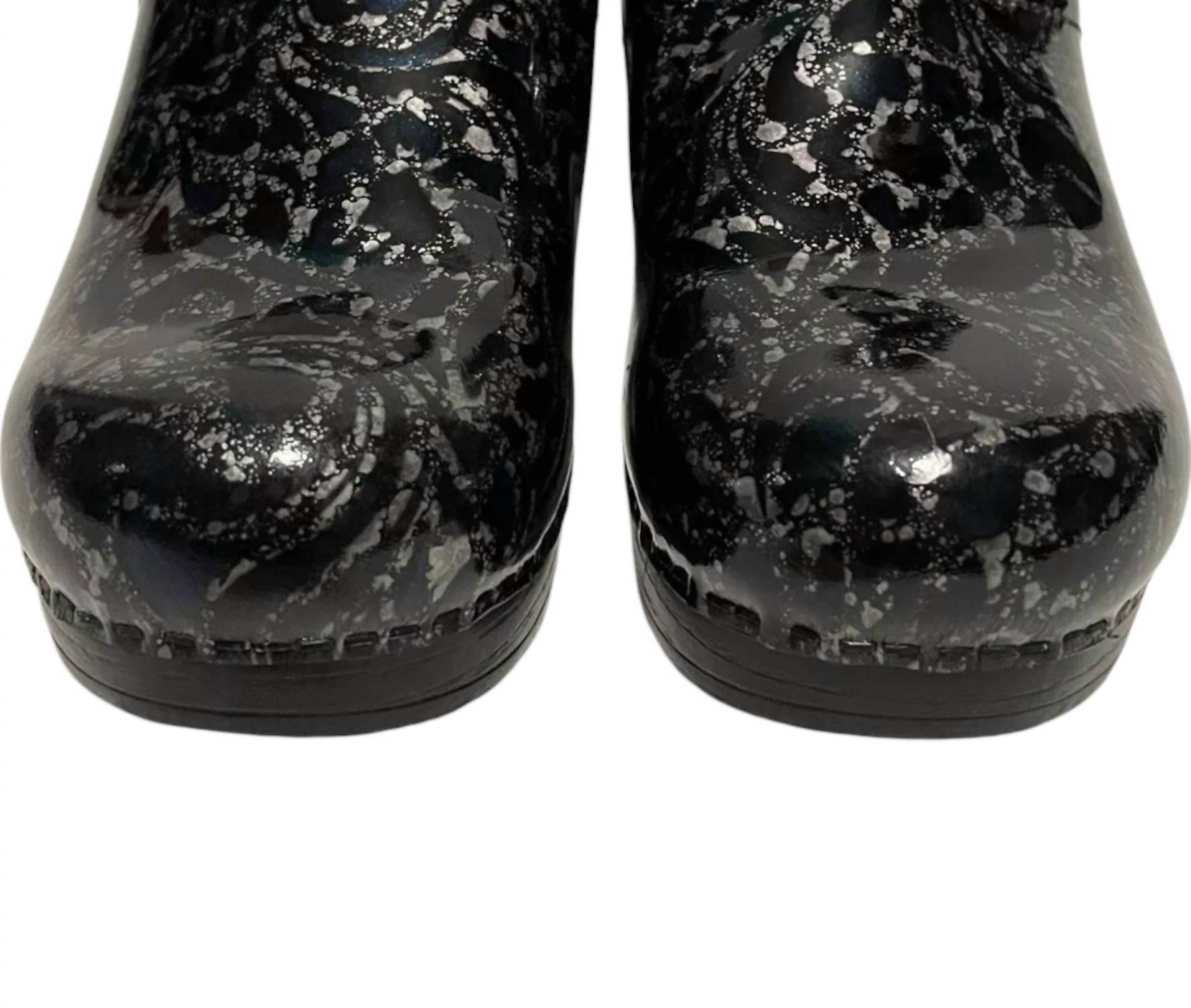 Easy-care patent leather upper. Padded instep collar for walking comfort. Roomy reinforced toe box for protection and toe space. Polyurethane outsole with rocker bottom for shock absorption and forward motion. Wide heel strike for improved stability. Leather sock lining for lasting comfort. Polyurethane inner frame for reduced torque and stability. TPU heel counter for free heel movement and lateral stability.