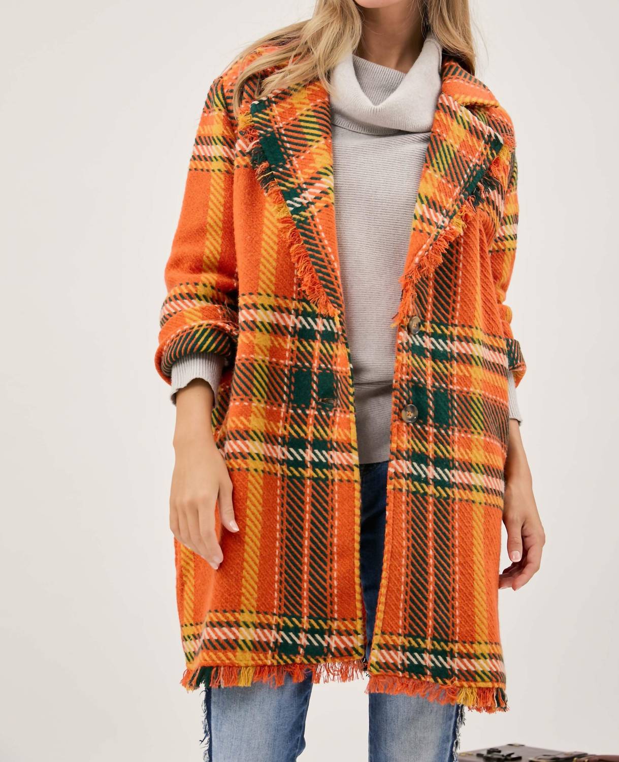 Introducing the Multi Plaid Button Front Jacket by DAVI & DANI, perfect for bringing a maximalist edge to your fall wardrobe. This women's jacket features a vibrant orange multi plaid pattern, a traditional collar, and long sleeves for a chic vacation-ready look. The button closure adds a classic touch, making it ideal for Thanksgiving gatherings or everyday wear. Elevate your casual style with this statement piece that blends trend and function effortlessly.