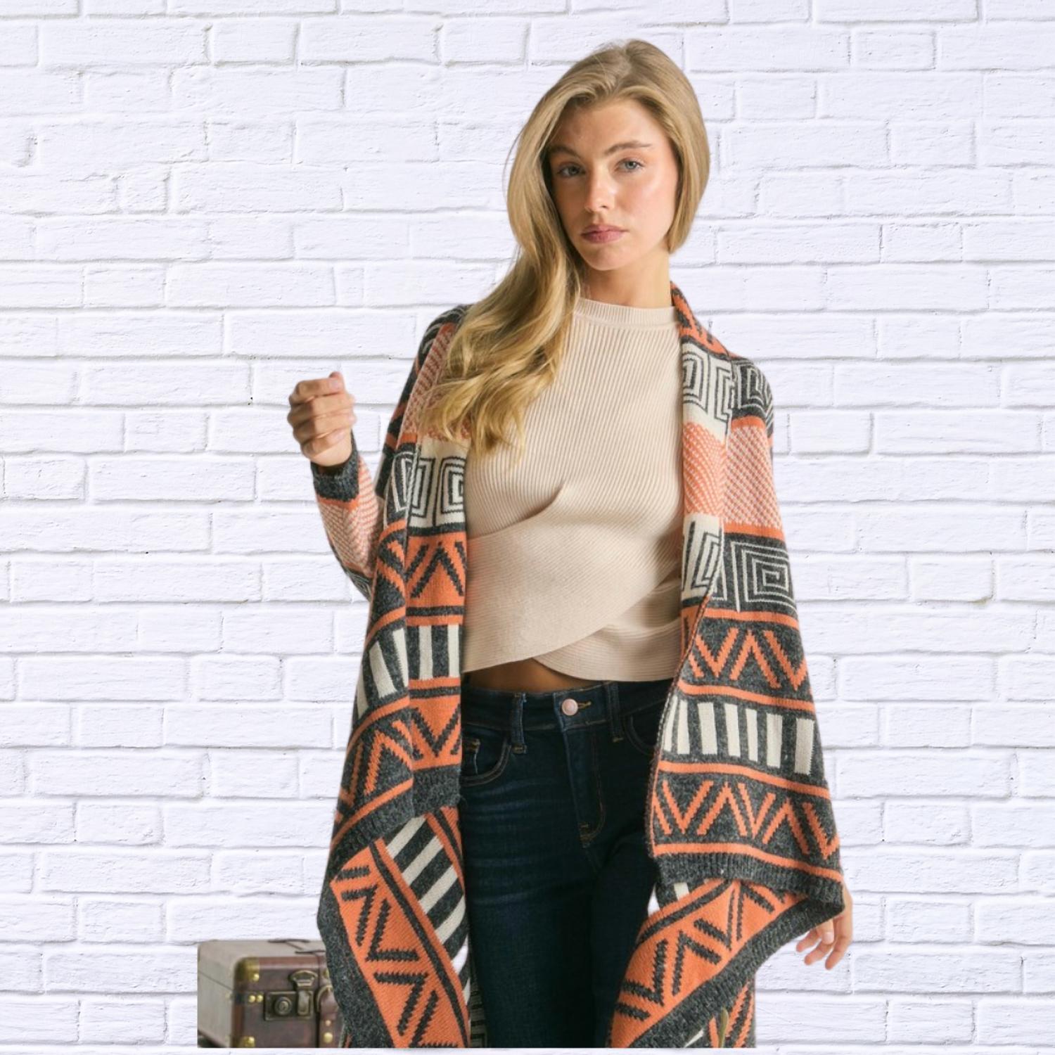 Introducing the Printed Shawl Fringed Hem Cardigan by DAVI & DANI, crafted from soft fleece and adorned with a vibrant tribal print in rust and black. This women's cardigan features long sleeves and a stylish fringed hem, perfect for fall layering. Designed for easy wear, it has a pull-on closure and a collar neckline, offering both comfort and convenience. Care for this piece by hand washing it, ensuring it remains a staple in your wardrobe for seasons to come.