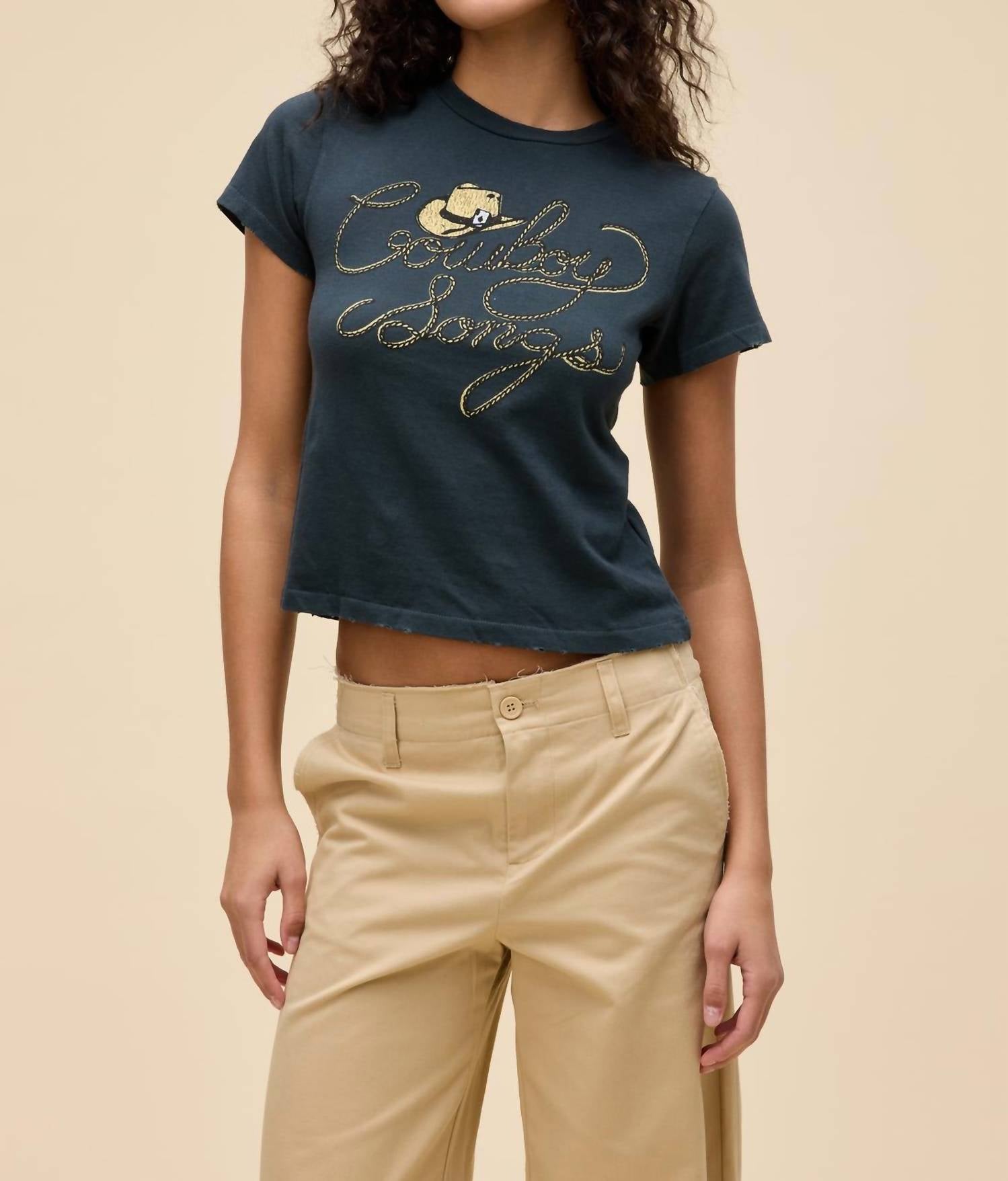 The short sleeve tee you'll want in every color. Embrace a touch of nostalgia with the Cowboy Songs Short Sleeve Tee by DAYDREAMER, perfect for those who love a country vibe. Crafted from 100% cotton, this vintage black tee features a crewneck and showcases a graphic print with lasso lettering and a cowboy hat. Its pull-on style, paired with hand-distressed rib accents, offers a relaxed yet stylish look. Care for this wardrobe staple by machine washing and laying it flat to dry.