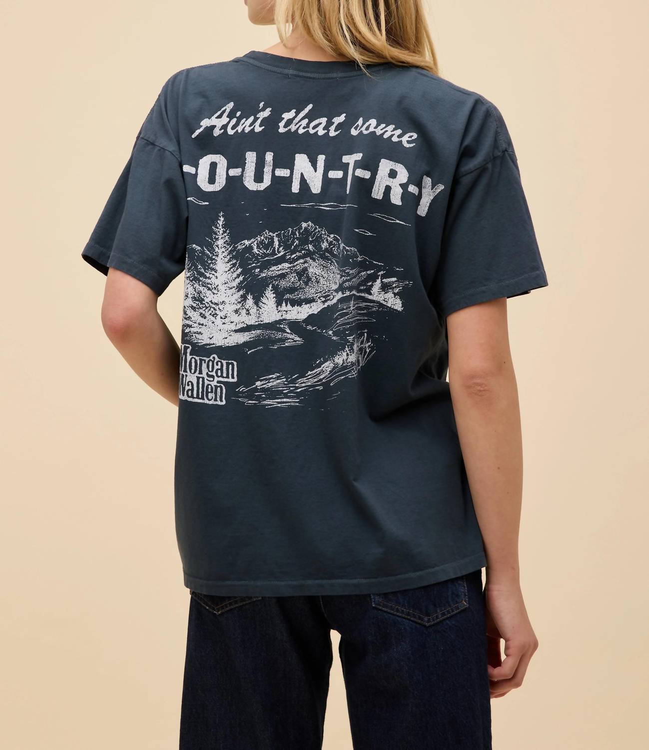 The short sleeve tee you'll want in every color. Featuring the lyric Morgan Wallen made famous. 'Ain't that some C-O-U-N-T-R-Y' from Wallen's winning track hits this backwoods feeling Merch Tee offering a truck graphic and rural motifs. FIT & FABRIC The Merch Tee is an oversized fit, designed in our midweight cotton to achieve the perfect drape. Accented with an open neckline and an authentic single needle ladder stitch at all hems. Model wears size S.