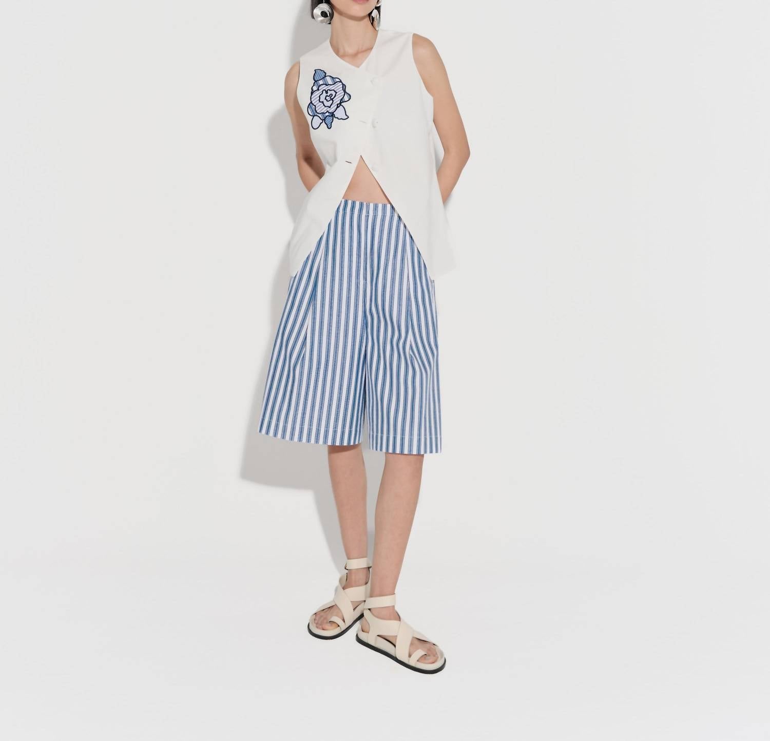 Introducing the Torito Bermuda Shorts by De Loreta, a perfect addition to your summer wardrobe with its minimalist and vacation-ready vibe. These high-waisted, knee-length shorts feature a charming white and blue stripe pattern and are crafted from 100% cotton for breathable comfort. Designed with an elastic waist and convenient side pockets, the pull-on closure ensures ease and versatility. Care instructions recommend hand washing to maintain their fresh, relaxed appearance.