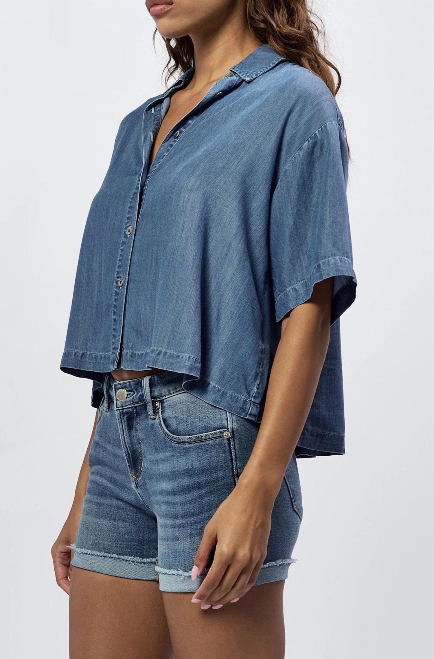 Pair this with your favorite jeans and slides for your next girls night out. Enhance your collection with the "NOWHERE ELSE" Button Front Top by DEAR JOHN DENIM, a chic choice for transitioning from day to night. Designed with short sleeves and crafted from eco-friendly tencel, this blouse offers both breathability and style in its relaxed, boxy silhouette. Composition includes blue fabric made of 100% Tencel and white fabric of 55% Linen, 45% Cotton. Closure: Button closure. Care: Machine wash cold on a gentle cycle, avoid bleach, and line dry to prevent shrinkage. A sophisticated staple for pairing with jeans or skirts.