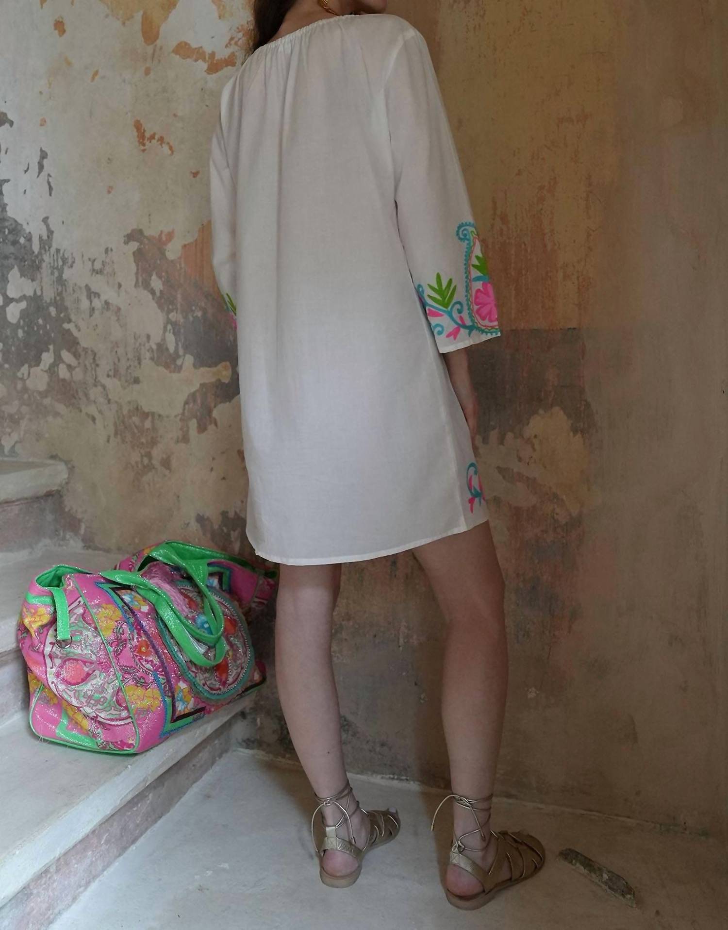Embrace the Boho Chic trend with the Women's Short Embroidered Tunic by Debbie Katz, crafted for summer vacations. Featuring long sleeves and a charming V-neck, this tunic in crisp white offers a patterned design that exudes effortless elegance. Offering a comfortable pull-on closure, it is perfect for easy styling during your next getaway.