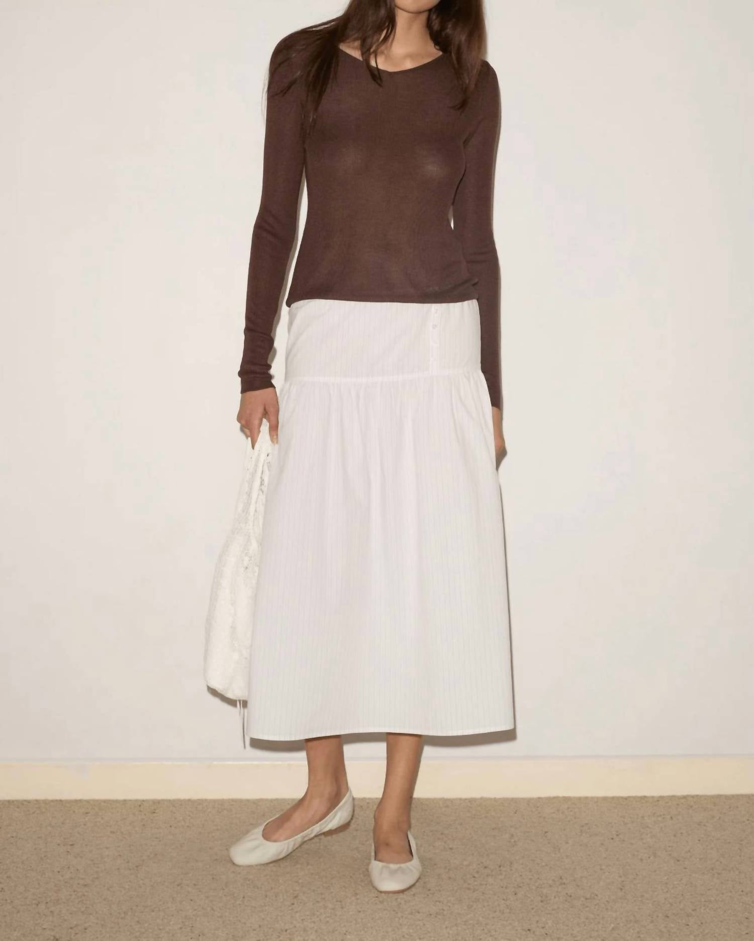 Wear this v-neck sweater with your favorite denim for the perfect fall look. Presenting the Knitted Long Sleeve Top by Deiji Studios, a sophisticated piece in dark brown perfect for any occasion. This knitted top features long sleeves, composed of 100% ecoviscose for ultimate comfort, and showcases sculptural seam details with exposed bind finishes. It sports a flattering cropped length and a soft wide V-neckline, emphasizing elegance in its simplicity. Care instructions include hand washing in cold water, line drying flat in shade, and cool ironing, while the pull-on closure ensures ease of wear.