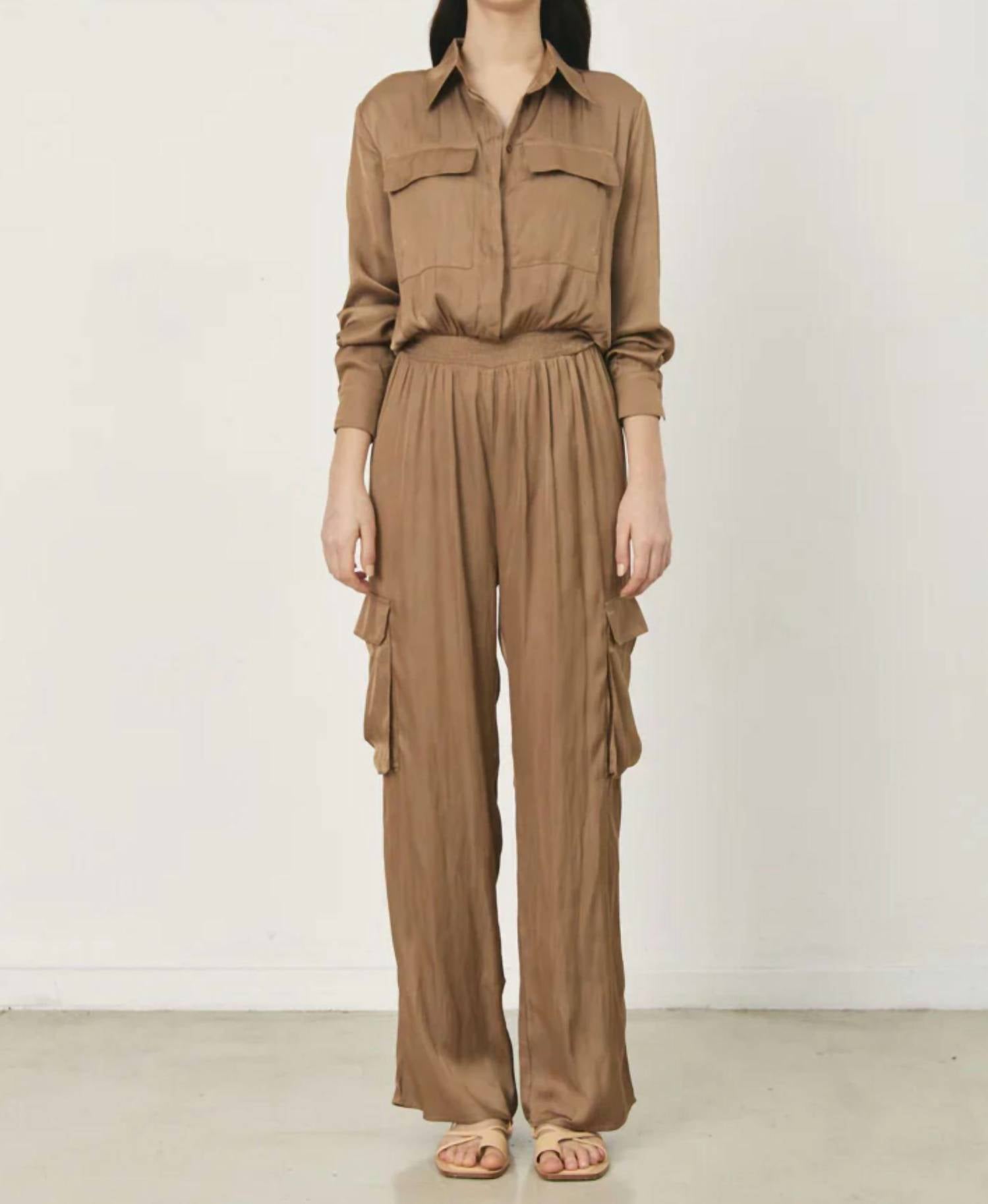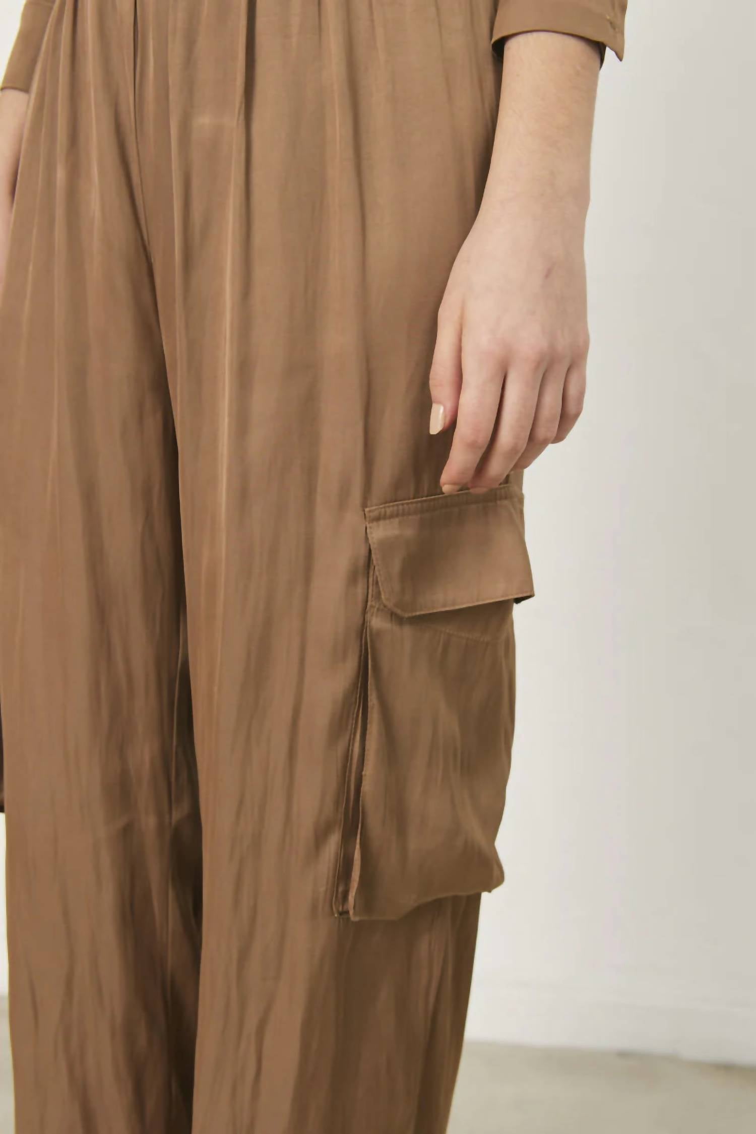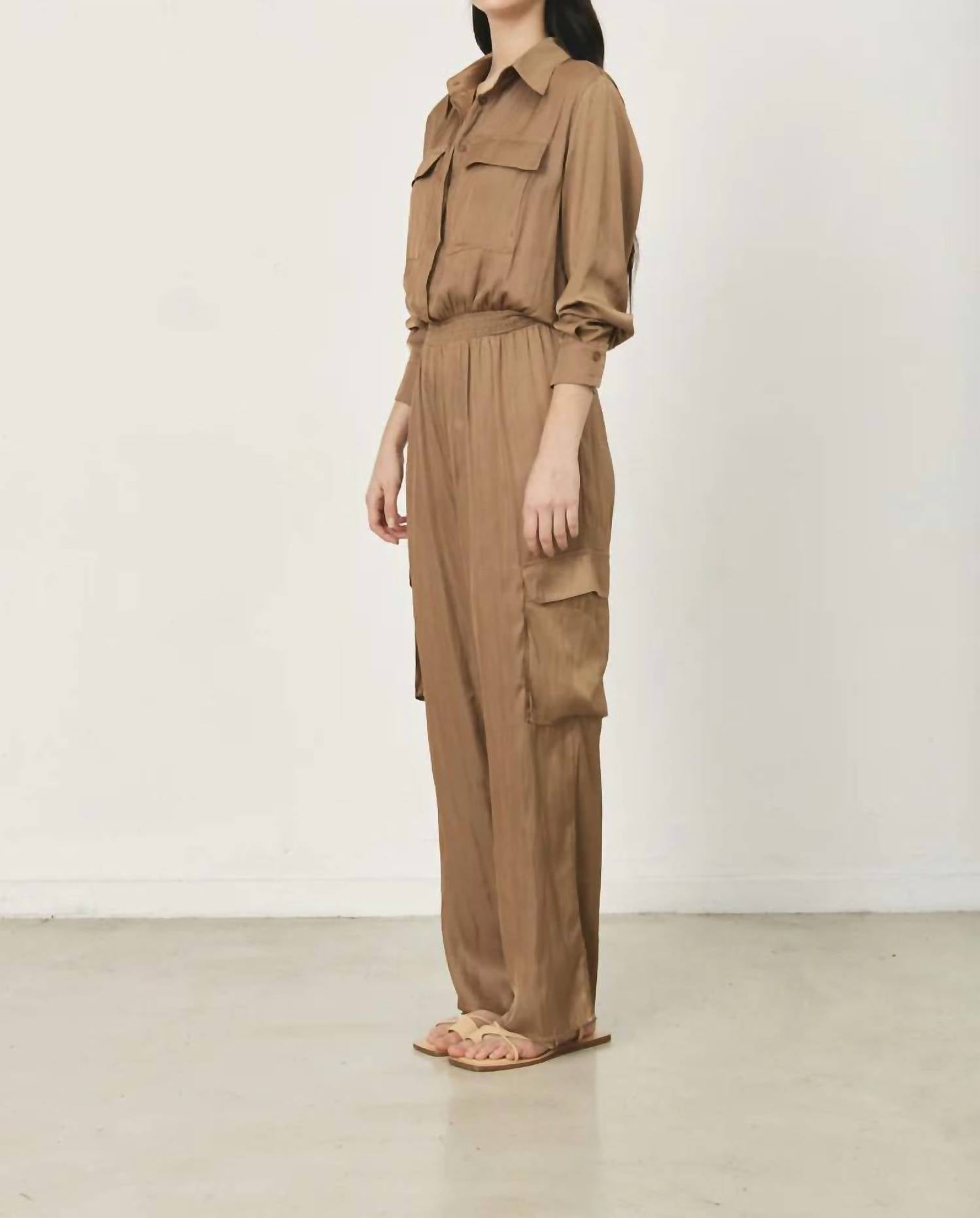 It doesn't take much for this one piece to look effortlessly cool. Add some statement jewelry to dress it up, or throw on some sneakers for a more casual vibe. Elevate your style with the Minujin Satin Jumpsuit by DELUC, perfect for any occasion. This elegant piece, designed for women, features long sleeves with buttoned cuffs, and a lapel collar, crafted from luxurious satin polyester in a solid brown shade. The jumpsuit offers a comfortable fit with its elastic waistband and wide-leg silhouette, enhanced by patch pockets on the chest and cargo pockets on the legs. Closure is a concealed button style, and care includes hand washing with laying flat to dry. Ideal for Thanksgiving, vacations, or simply making a streetwear statement this summer.