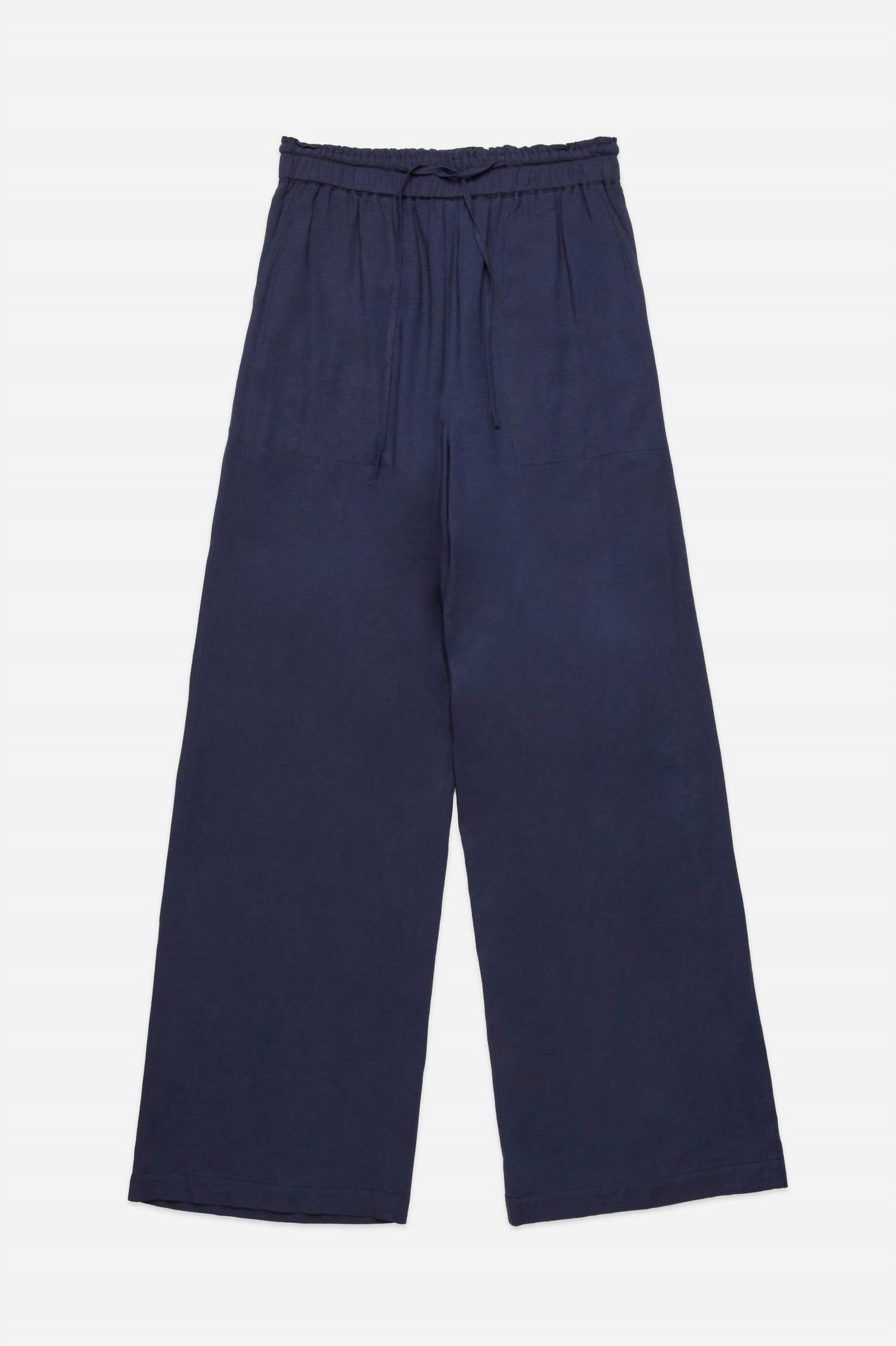 Discover the Roxa Pant by DELUC, a chic addition to your wardrobe in a refined navy hue. Crafted from a comfortable linen blend, these wide-leg trousers feature a relaxed fit, making them perfect for effortless style. The elasticized waistband with drawstrings ensures a secure pull-on closure, while front and faux back welt pockets add functional flair. Ideal for pairing with the Roxa Shirt, these pants are a must-have for any fashion-forward woman.