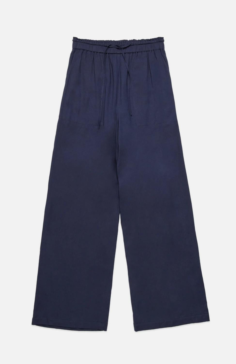 Introducing the Roxa Pants by DELUC, a chic addition to your summer wardrobe in an elegant navy solid color. Crafted from a linen blend, these wide-leg pants feature a relaxed fit perfect for a minimalist, vacation vibe. Designed with an elasticized waistband with tie closure, they come equipped with front pockets and fake welt pockets at the back for added practicality. Embrace effortless style with these versatile pants, ideal for any summer occasion.