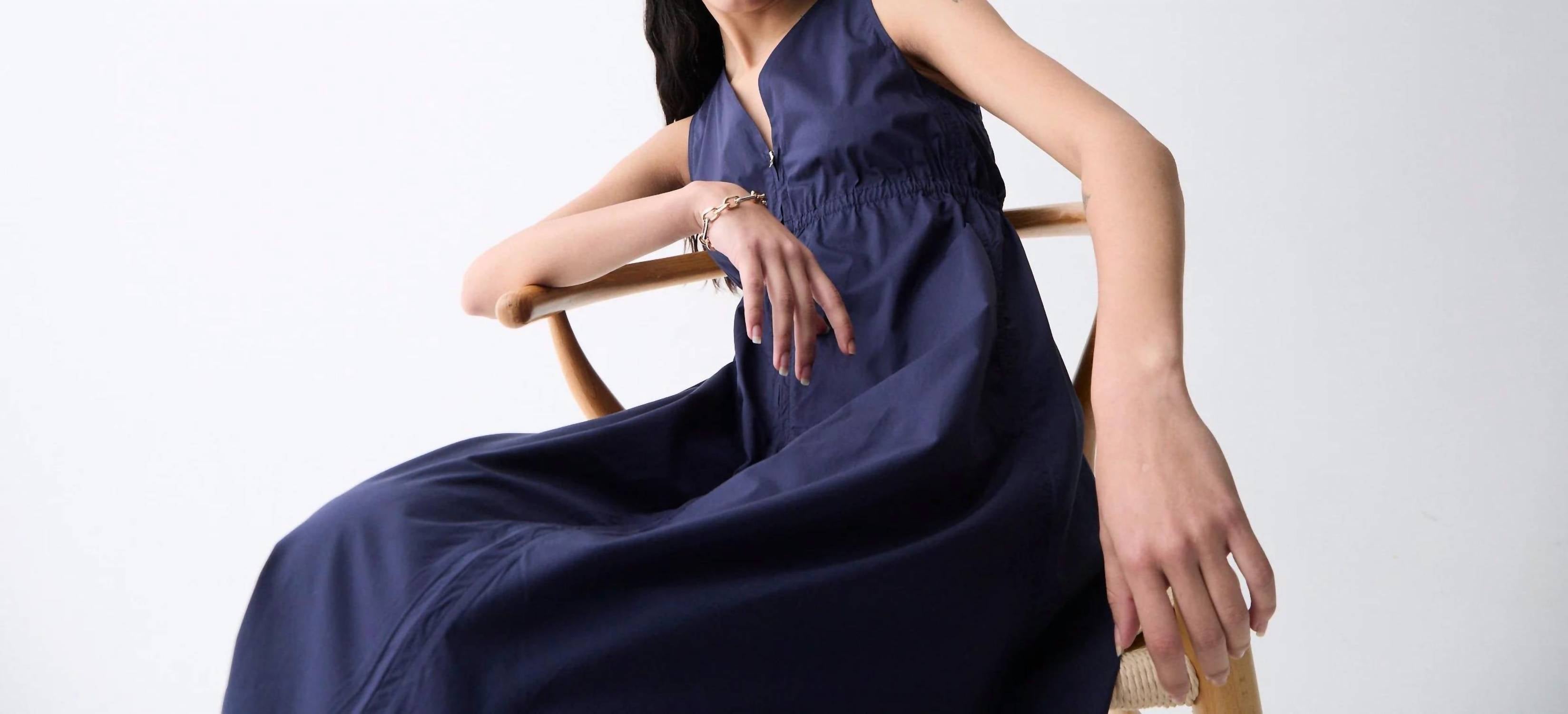 Just add slides or mules and you are good to go. Poplin maxi features a V-neck and sleeveless. Measures 50 1/2" length. Perfect for complementing any silhouette with its elasticized waist and flared skirt. Made from 100% cotton. Boasts practical side-seam pockets and a convenient front zip closure. Care for it with ease, machine wash and line dry to maintain its style.