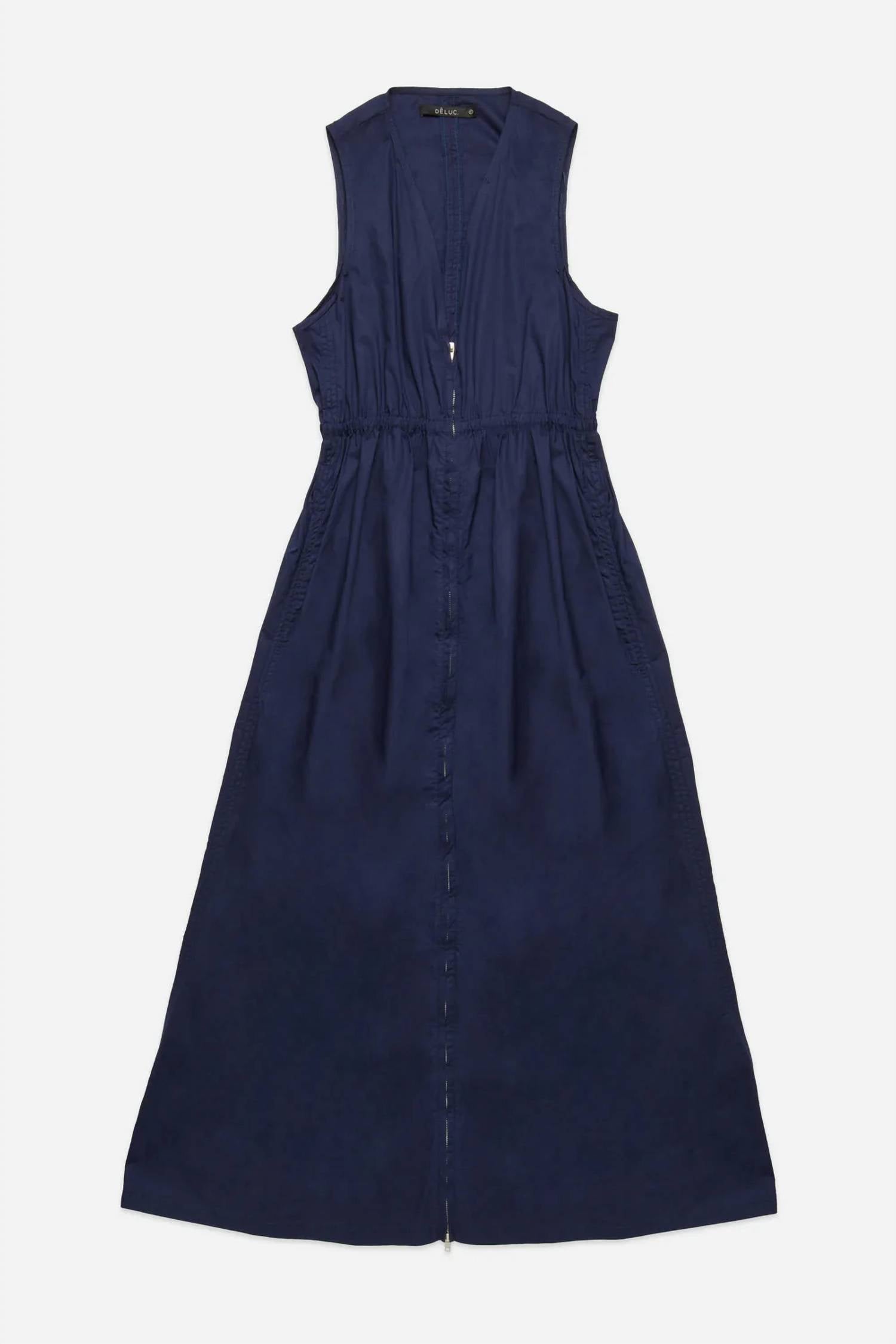 Poplin maxi features a V-neck and sleeveless. Measures 50 1/2" length. Perfect for complementing any silhouette with its elasticized waist and flared skirt. Made from 100% cotton. Boasts practical side-seam pockets and a convenient front zip closure. Care for it with ease, machine wash and line dry to maintain its style.