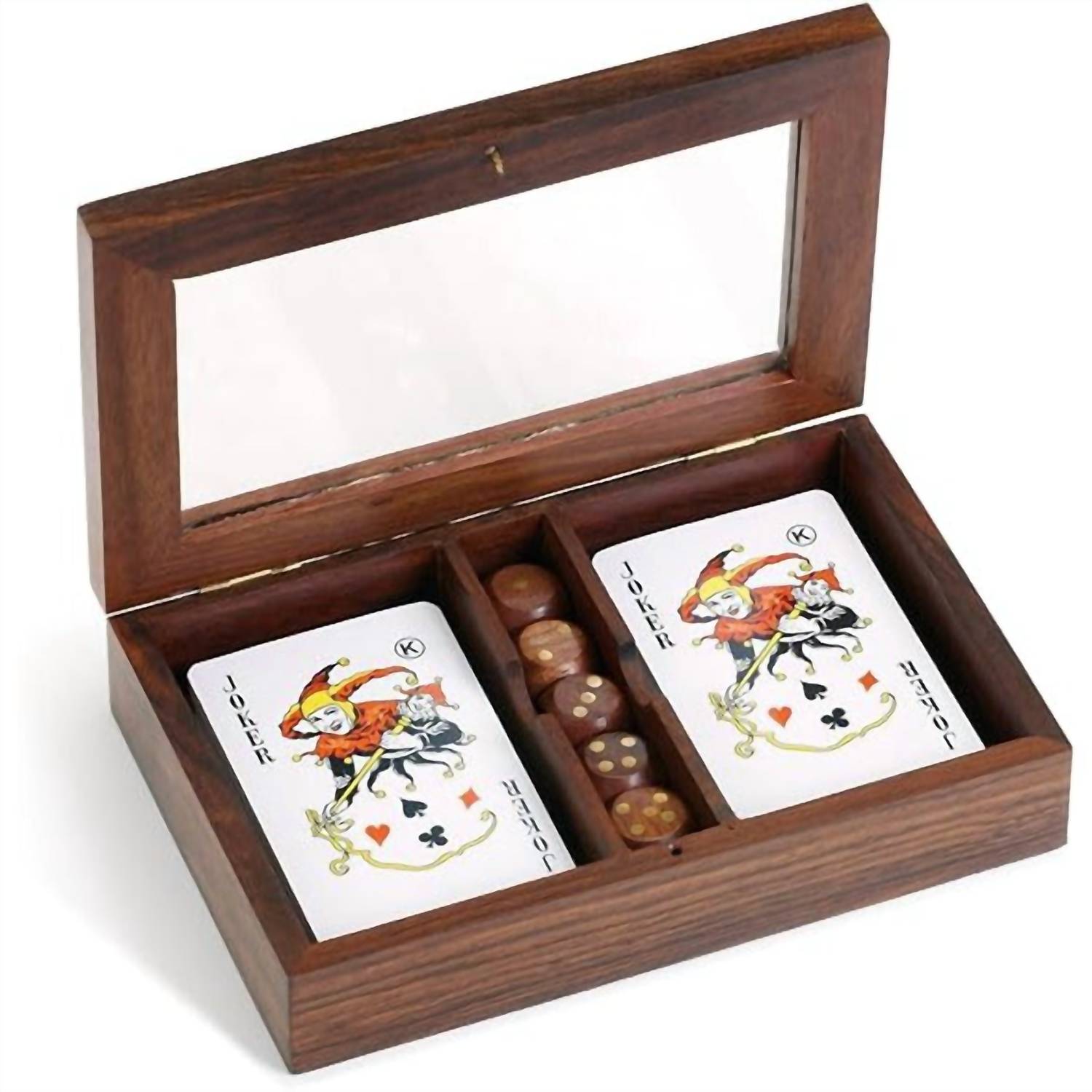 Inside the wooden case you'll find two decks of cards and 5 dice. Packaging Info: Corrugate Box. Materials: solid wood, playing cards, brass, glass. Measurements: 7"w x 1.5"h