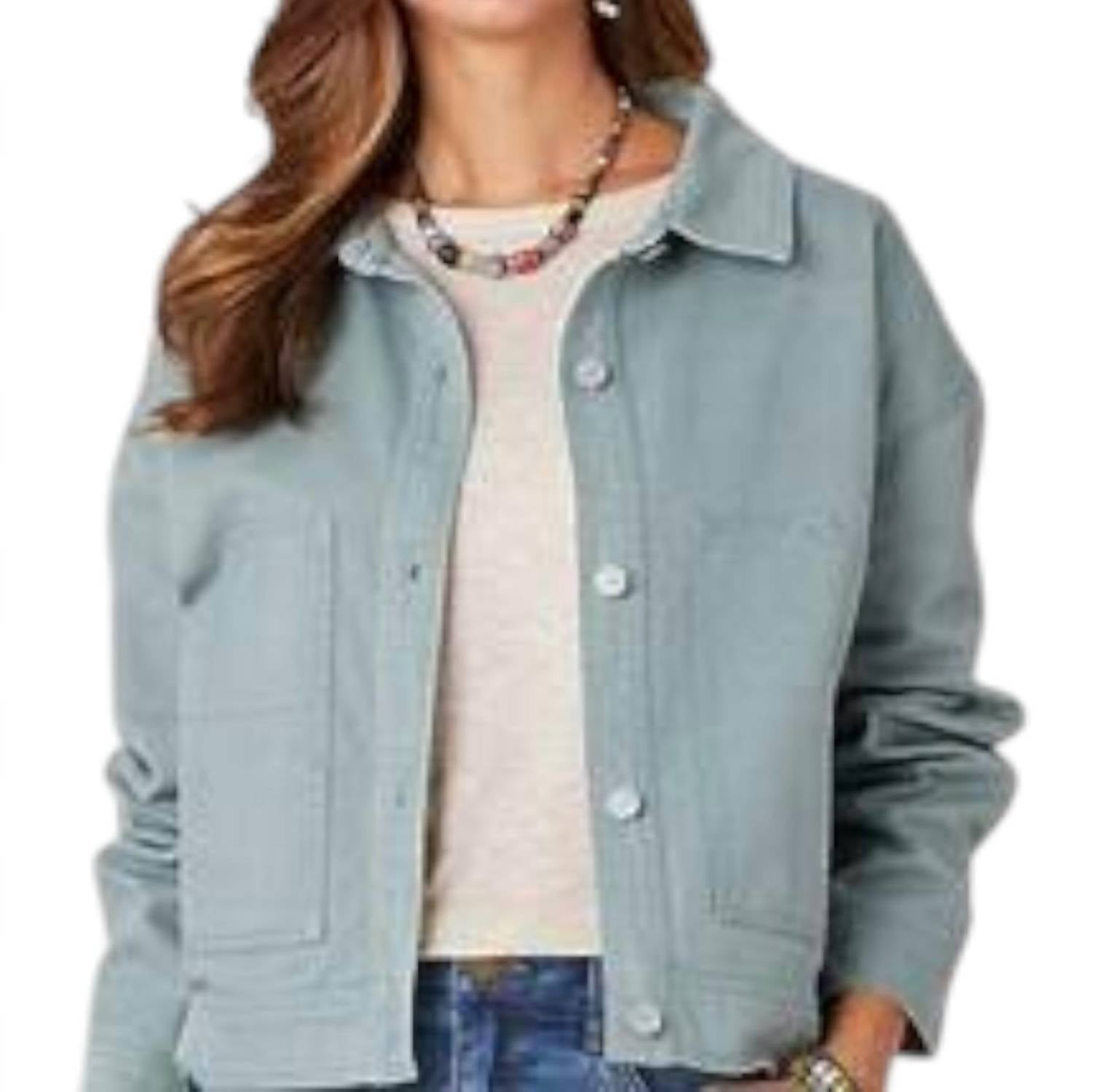 Must-have for your streetwear wardrobe in Dusty Slate. Solid-patterned jean jacket is crafted from sturdy cotton twill. Offering durability with its relaxed fit and practical design, including multiple roomy patch pockets. Features a classic collar and button closure that complements its long sleeves, perfect for travel occasions this fall. Designed for easy care, recommended to hand wash this elegant piece.