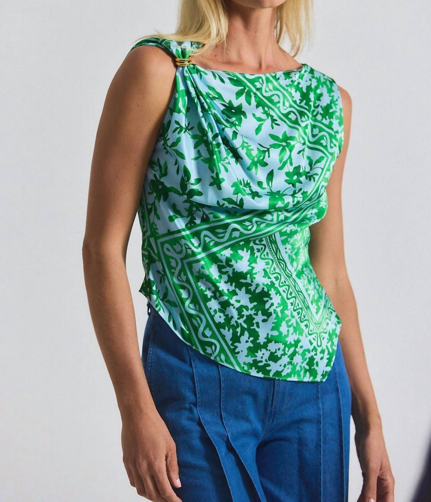 A timeless blouse that will never go out of style. Presenting the Ariel Tile Print Asymmetrical Top by Derek Lam 10 Crosby, a sophisticated choice for any occasion. This sleeveless top in Kelly Green Multi boasts a watercolor tile print, embellished with gold rings on one shoulder to create subtle gathering. Its body-skimming design and boatneck make it perfect for pairing with high-waisted jeans or trousers. Composition: 53% Rayon, 47% Viscose. Closure: Pull on. Care: Dry clean only.