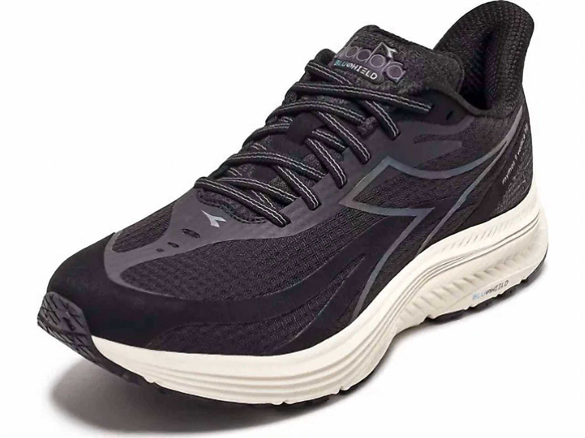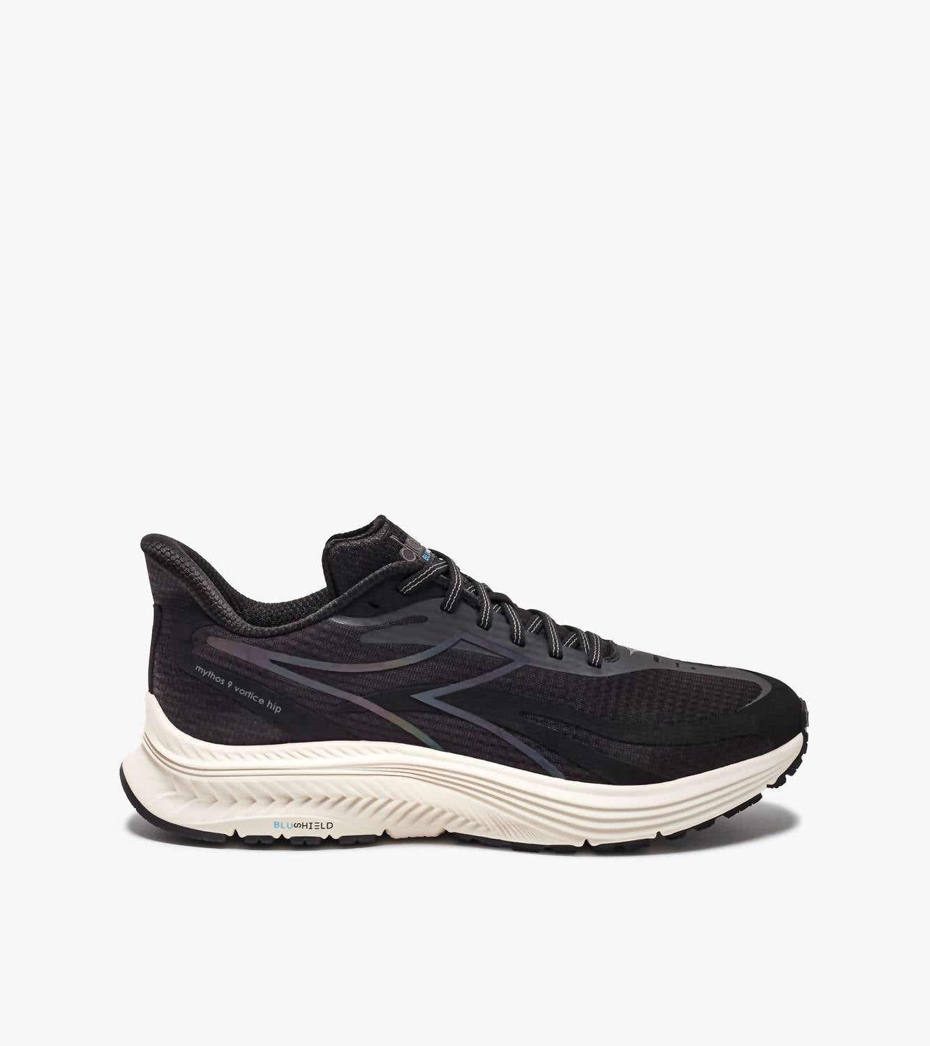 Meet the Diadora Men Mythos Blushield Vortice 9 Hip Running Shoes, expertly crafted for your active lifestyle. The upper is made from breathable Italian-styled air mesh nylon with reflective details, ideal for low visibility conditions. The midsole features a shock-absorbing Light EVA compound and Blushield technology to ensure a balanced run. The outsole combines blown soft rubber at the front with a durable Duratech 5000 heel, set in a stylish Black/Steel Gray. Designed with a round toe and flat heel for ultimate comfort and performance.